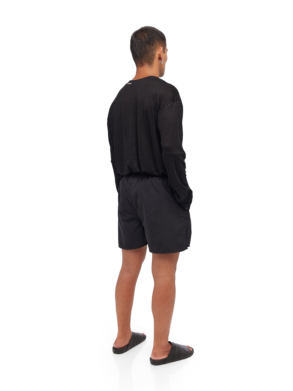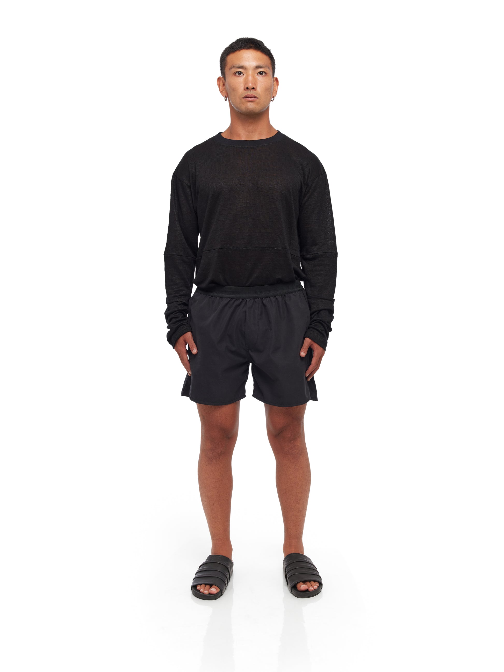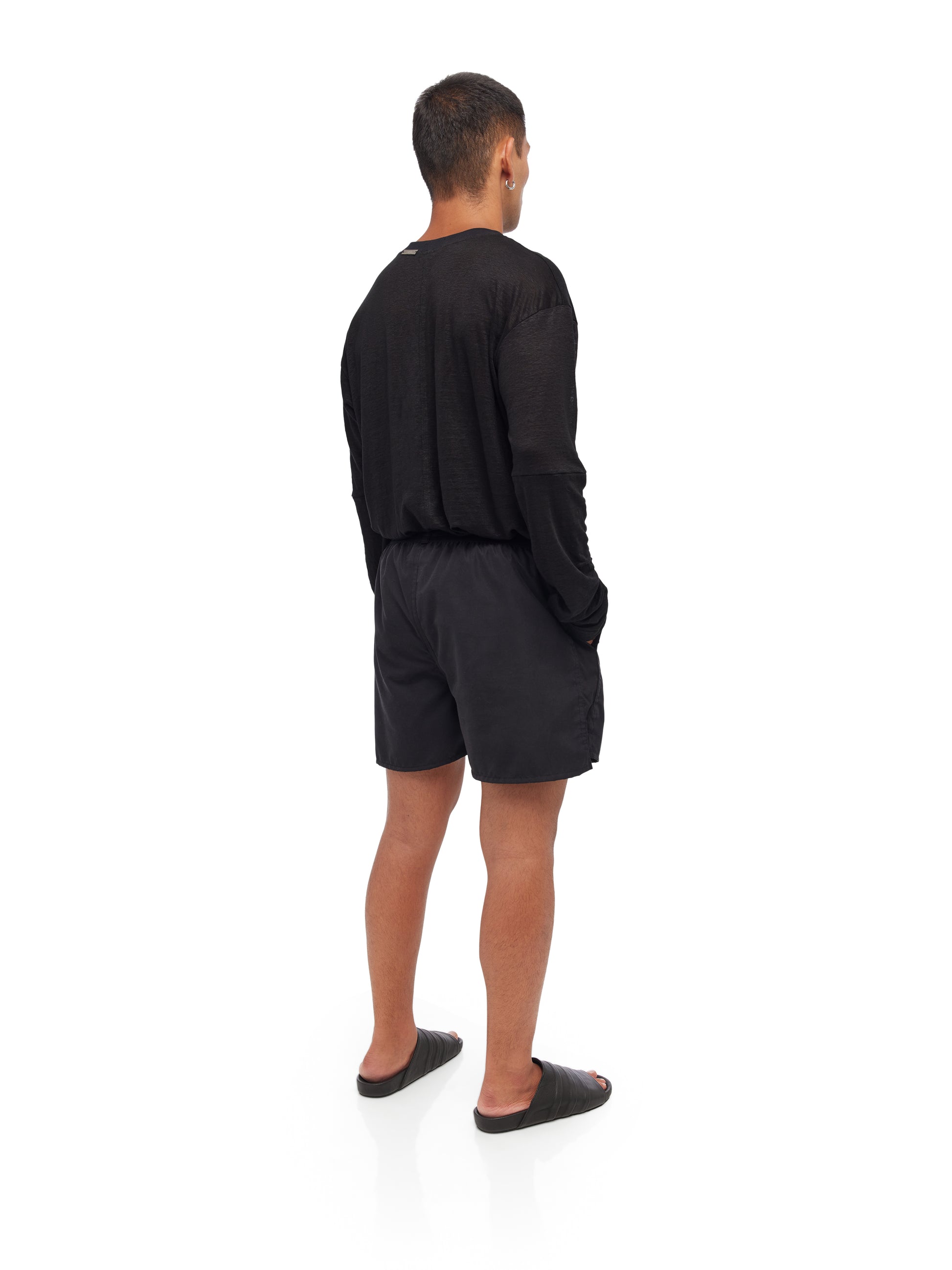 Step into comfort with the YA|SAR Active Stretch Shorts, designed to cater to both style and functionality. Crafted from a blend of 45% cotton, 45% polyester, and 10% elastane, these shorts ensure a perfect balance of flexibility and durability. Featuring an exposed elasticized waistband, they offer an excellent fit that adjusts to your movements, making them ideal for active or casual wear. The black color adds a versatile touch to your wardrobe, easy to pair with any top for a complete look. Additional features include a metal tag detailing and two exposed side pockets, providing a practical and stylish edge. Male model is wearing size M and is 180 cm tall.