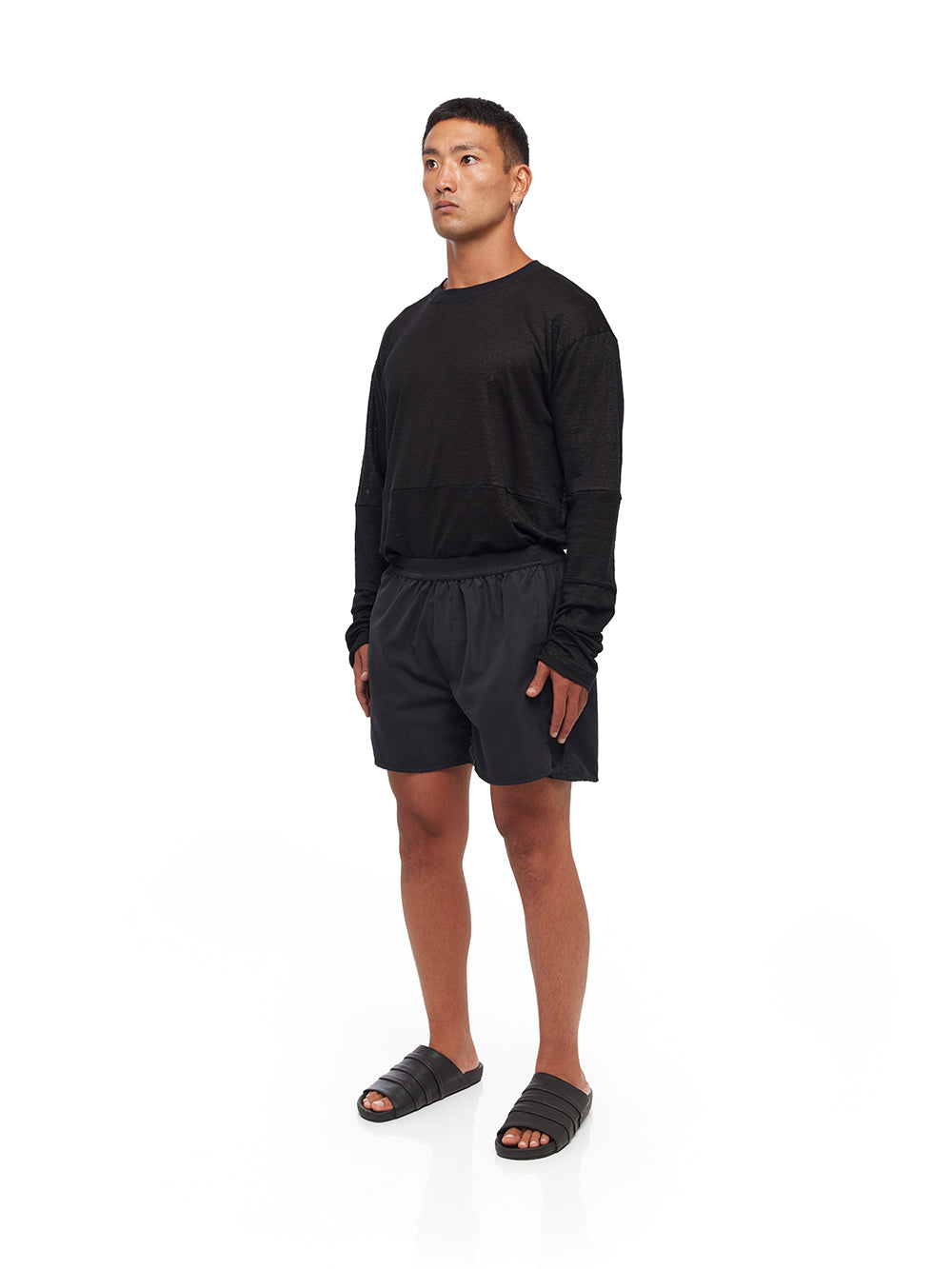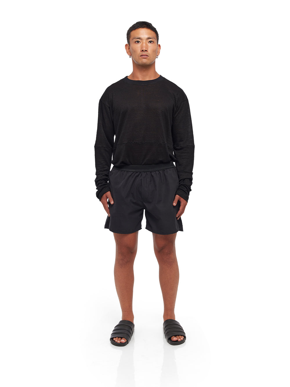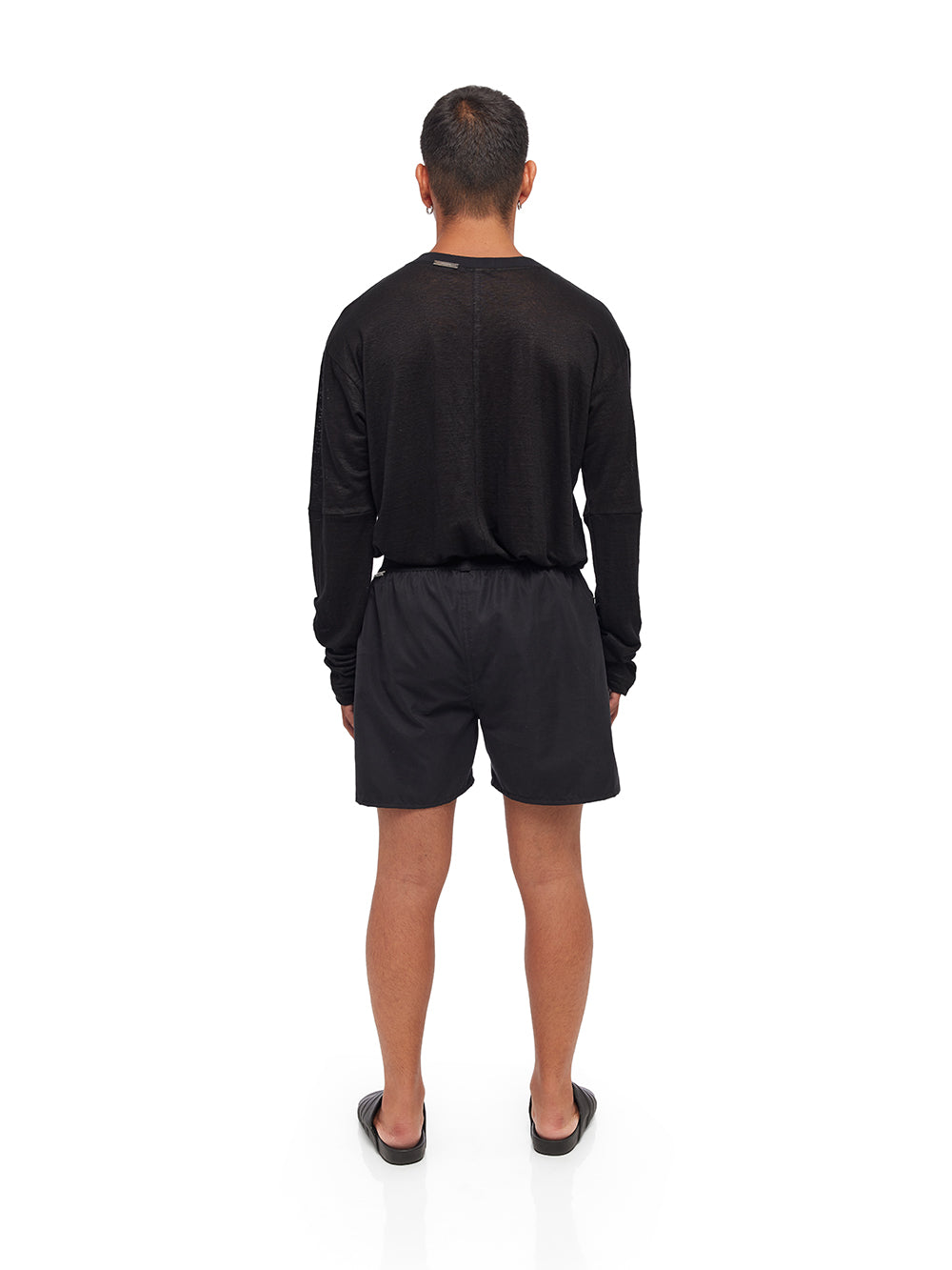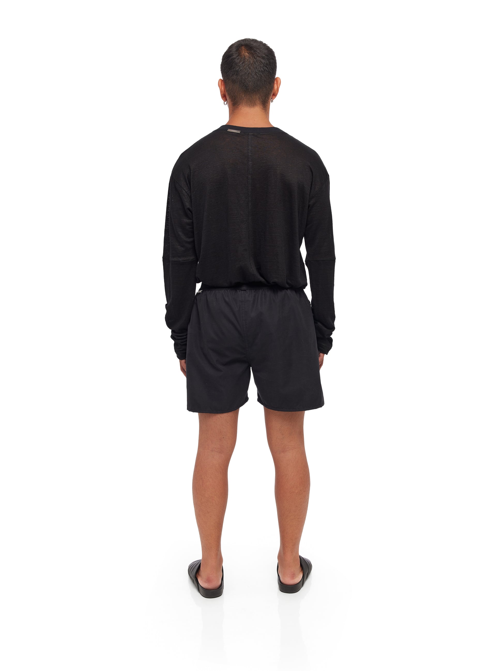 Step into comfort with the YA|SAR Active Stretch Shorts, designed to cater to both style and functionality. Crafted from a blend of 45% cotton, 45% polyester, and 10% elastane, these shorts ensure a perfect balance of flexibility and durability. Featuring an exposed elasticized waistband, they offer an excellent fit that adjusts to your movements, making them ideal for active or casual wear. The black color adds a versatile touch to your wardrobe, easy to pair with any top for a complete look. Additional features include a metal tag detailing and two exposed side pockets, providing a practical and stylish edge. Male model is wearing size M and is 180 cm tall.