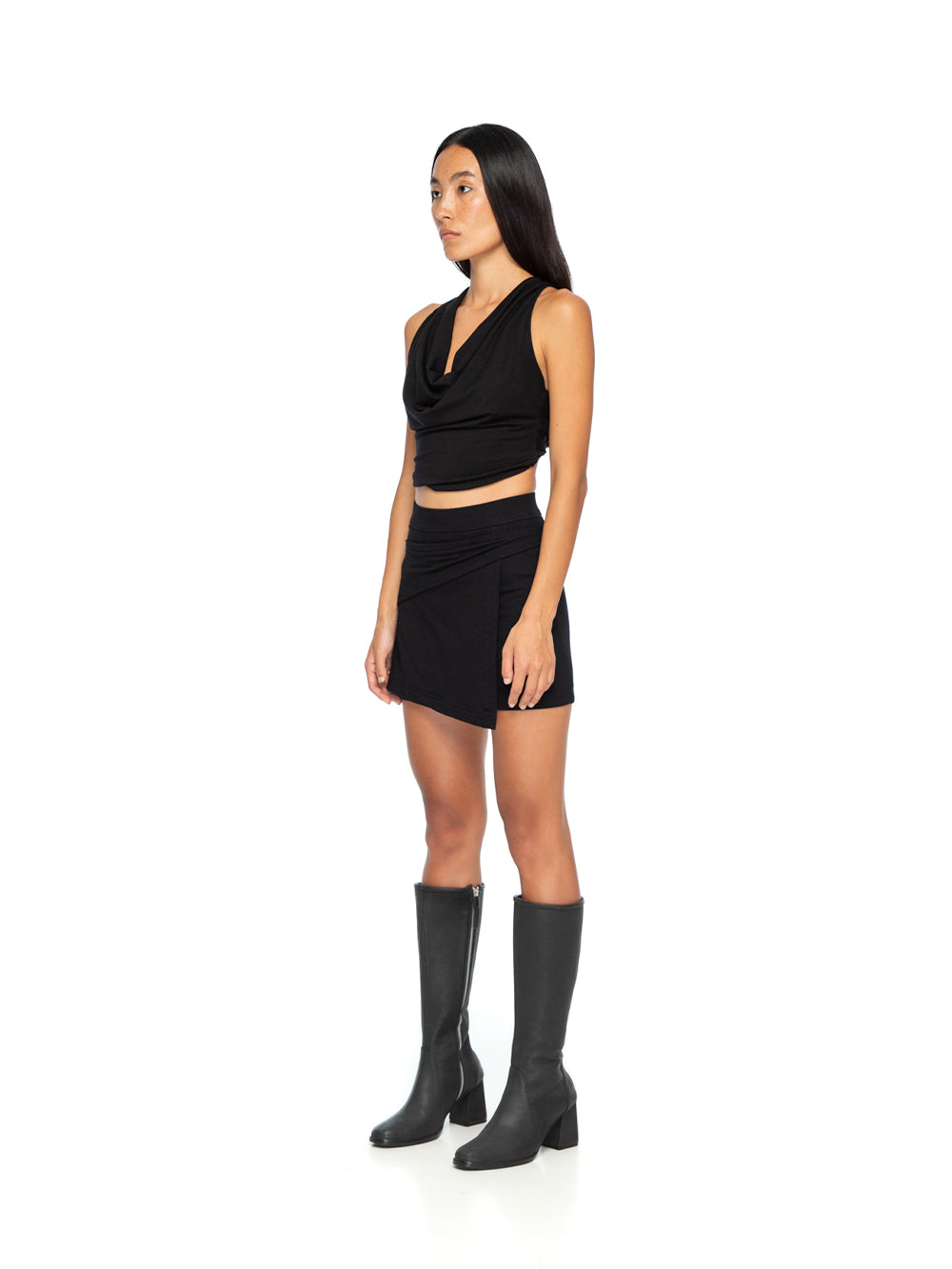 The Asymmetric Skirt from YA|SAR embodies timeless sophistication and modern allure. Designed in a sleek black hue, this skirt features an elegant asymmetric hemline and a flattering high-waist fit that accentuates your silhouette. Crafted from 67% Bamboo, 28% Cotton, and 7% Spandex. it offers a smooth and comfortable fit perfect for day-to-night styling. Pair it with a chic crop top or a structured blazer for a versatile look. With its refined edge and minimalist aesthetic, the Asymmetric Skirt is your go-to piece for making a bold yet understated statement. Woman model is wearing size S and is 178 cm tall.