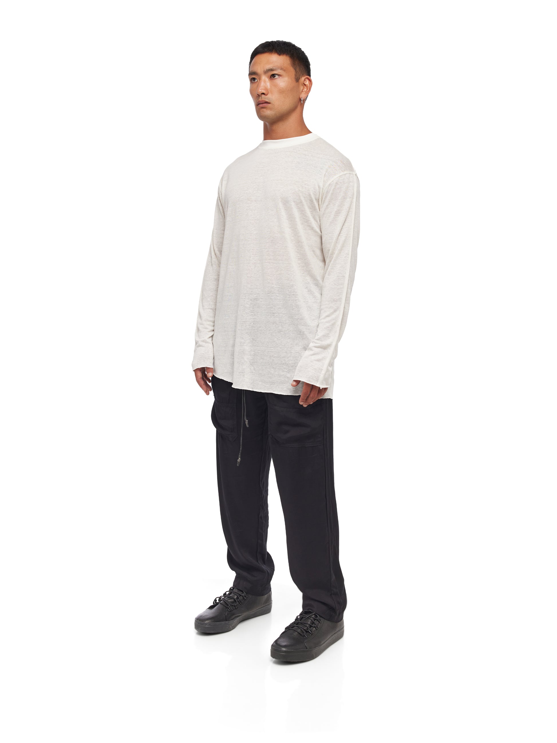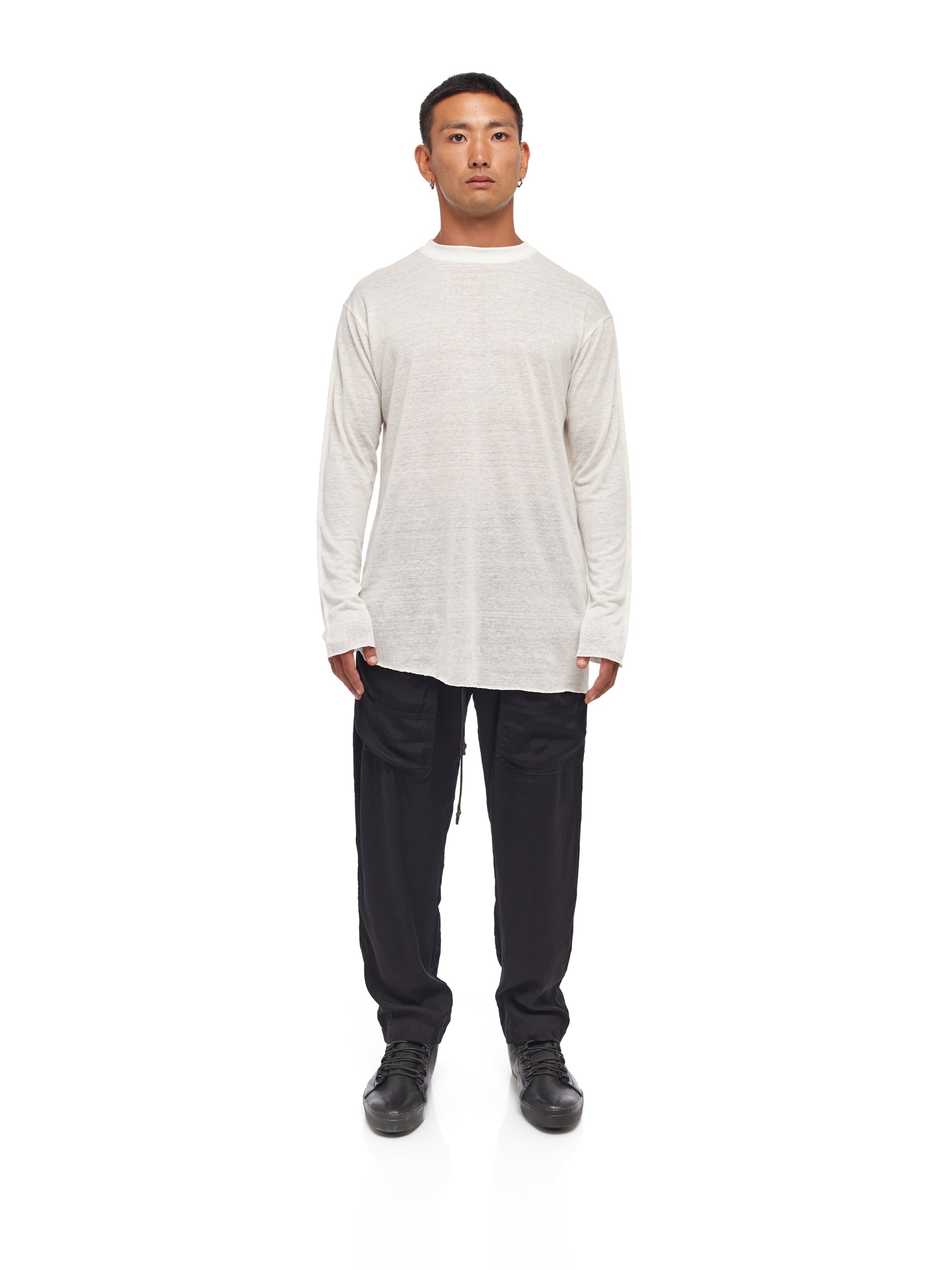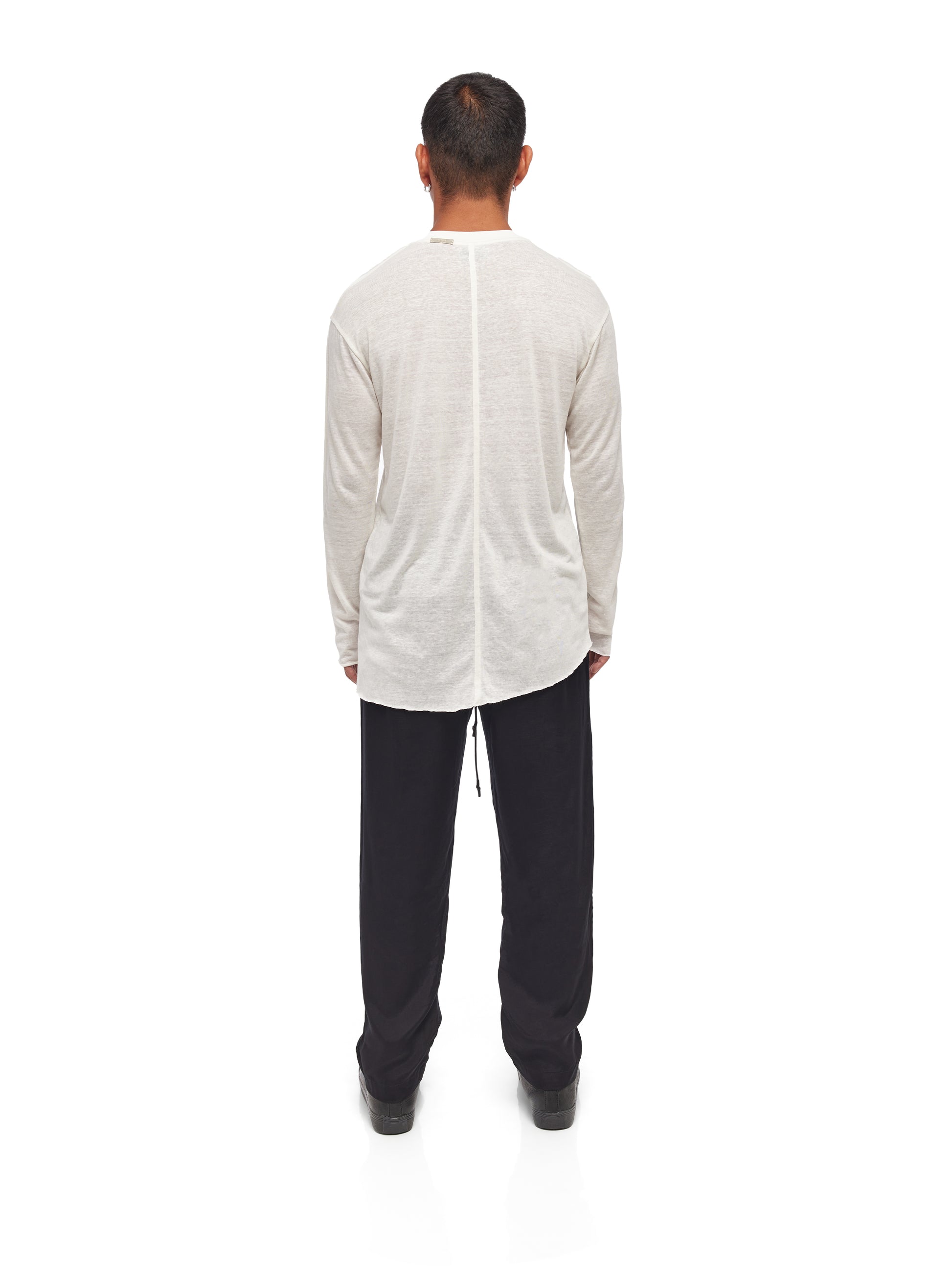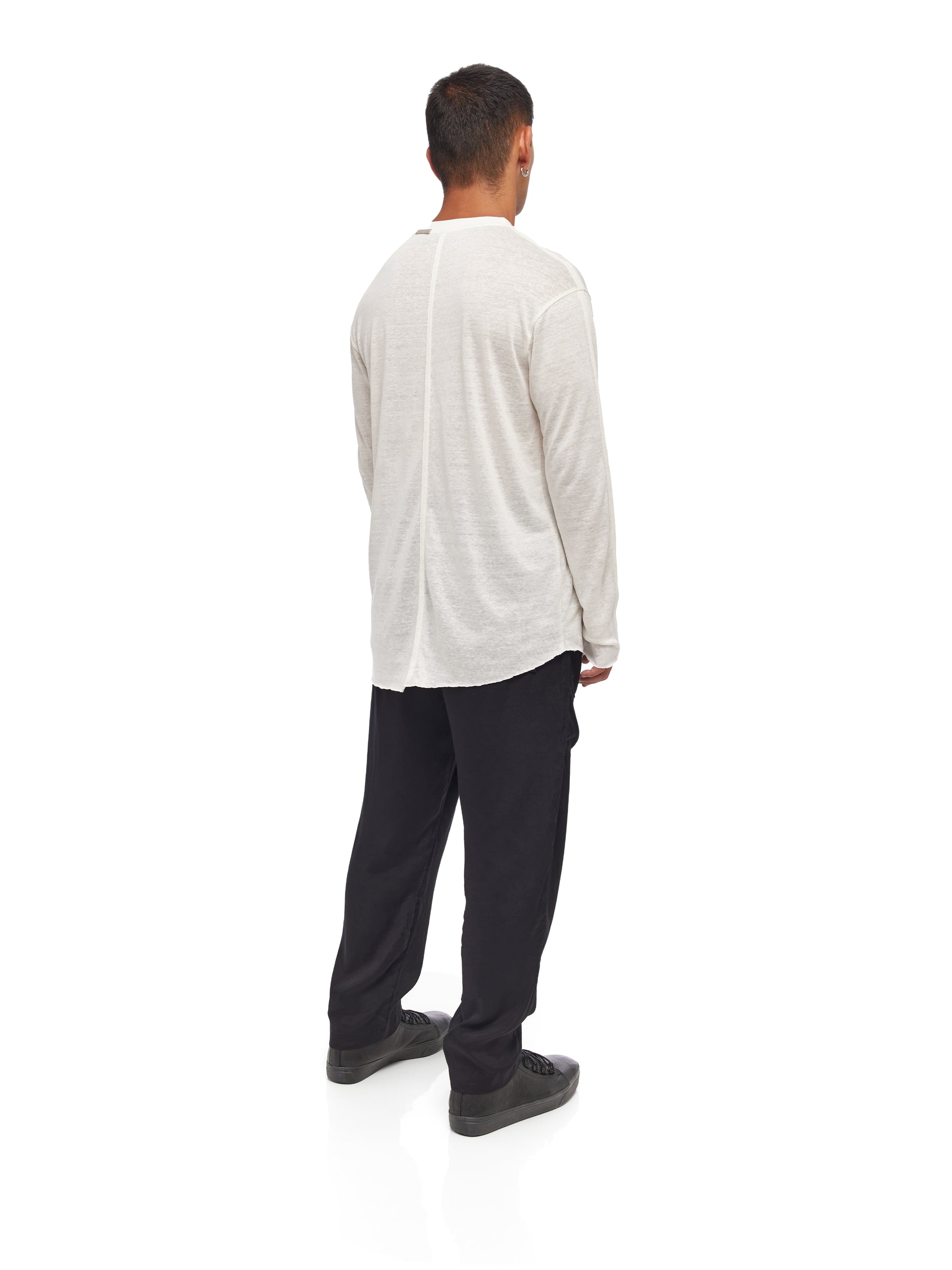 Crafted from 100% Linen, this YA|SAR long sleeve shirt exudes a raw, understated elegance with its jersey fabric that promises breathability and comfort. Available in classic black and off white, the shirt's design includes a ribbed neck that adds a touch of refined casualness. The overall look is enhanced by over stitching and unfinished detailing, providing a deliberately deconstructed aesthetic that captures a modern, edgy vibe. The back line stitch detailing adds an element of design depth, while the unfinished hems reinforce the shirt's avant-garde appeal. Metal tag detailing subtly imprints the YA|SAR signature. Male model is wearing size OS and is 180 cm tall.
