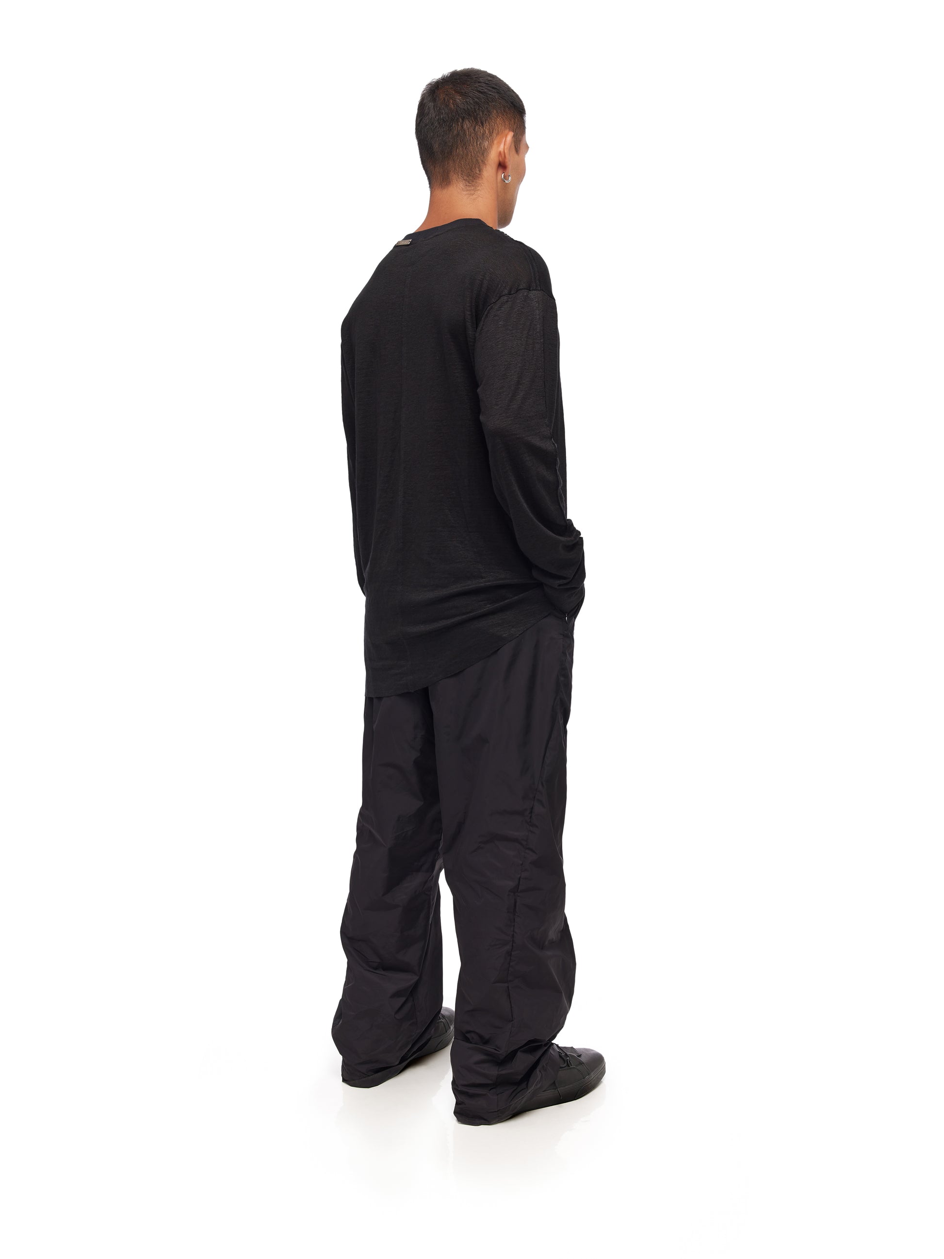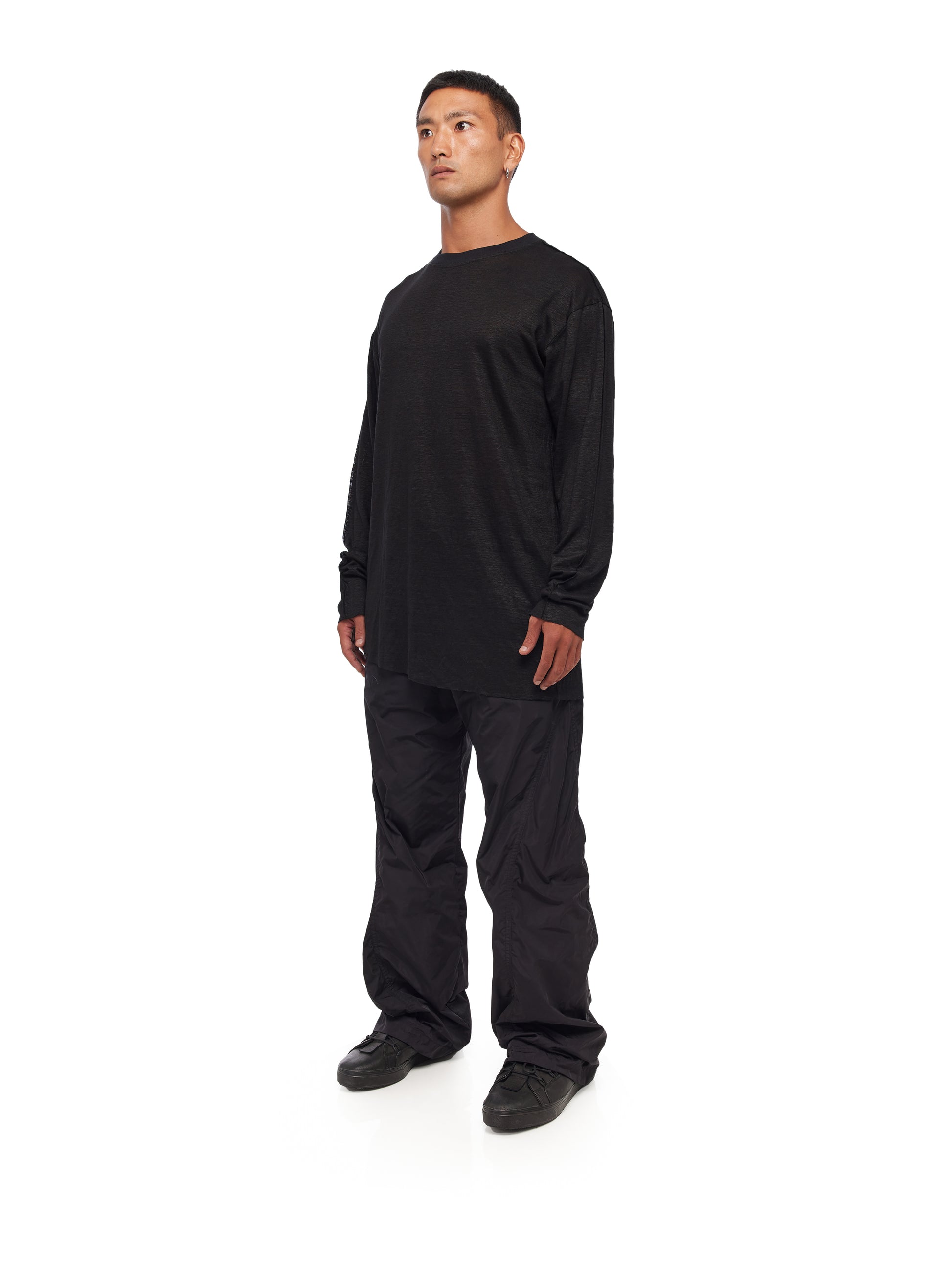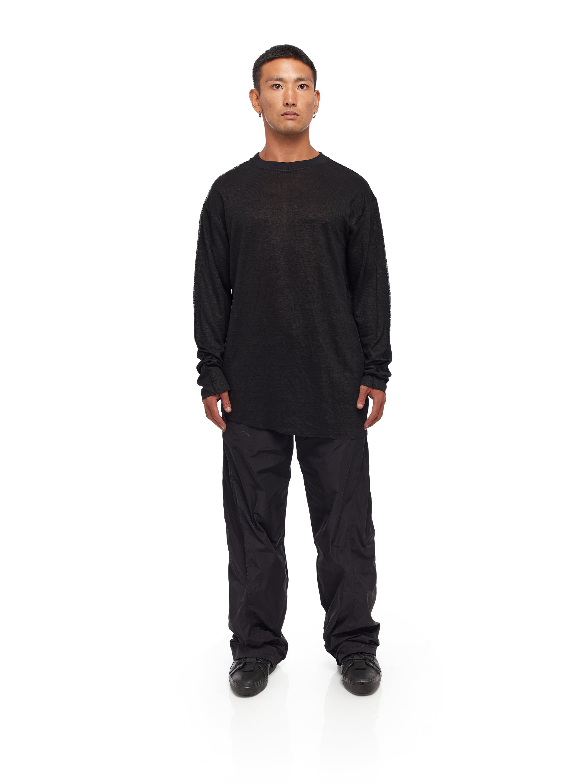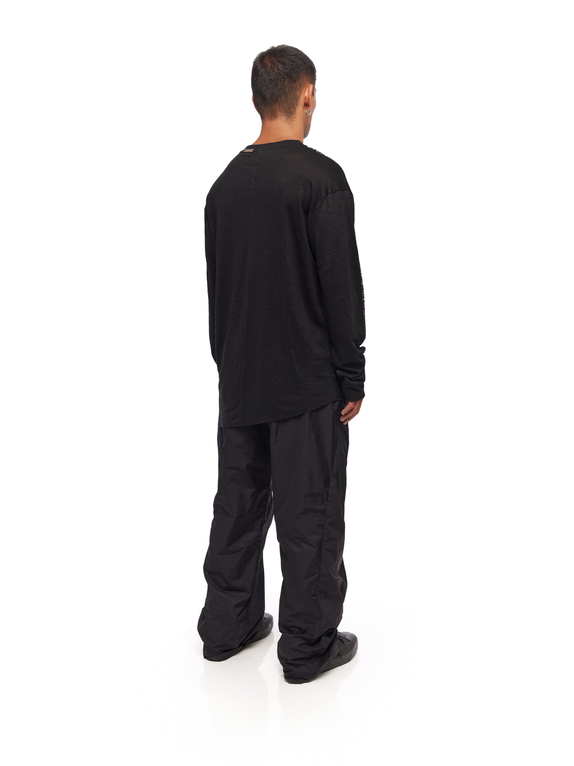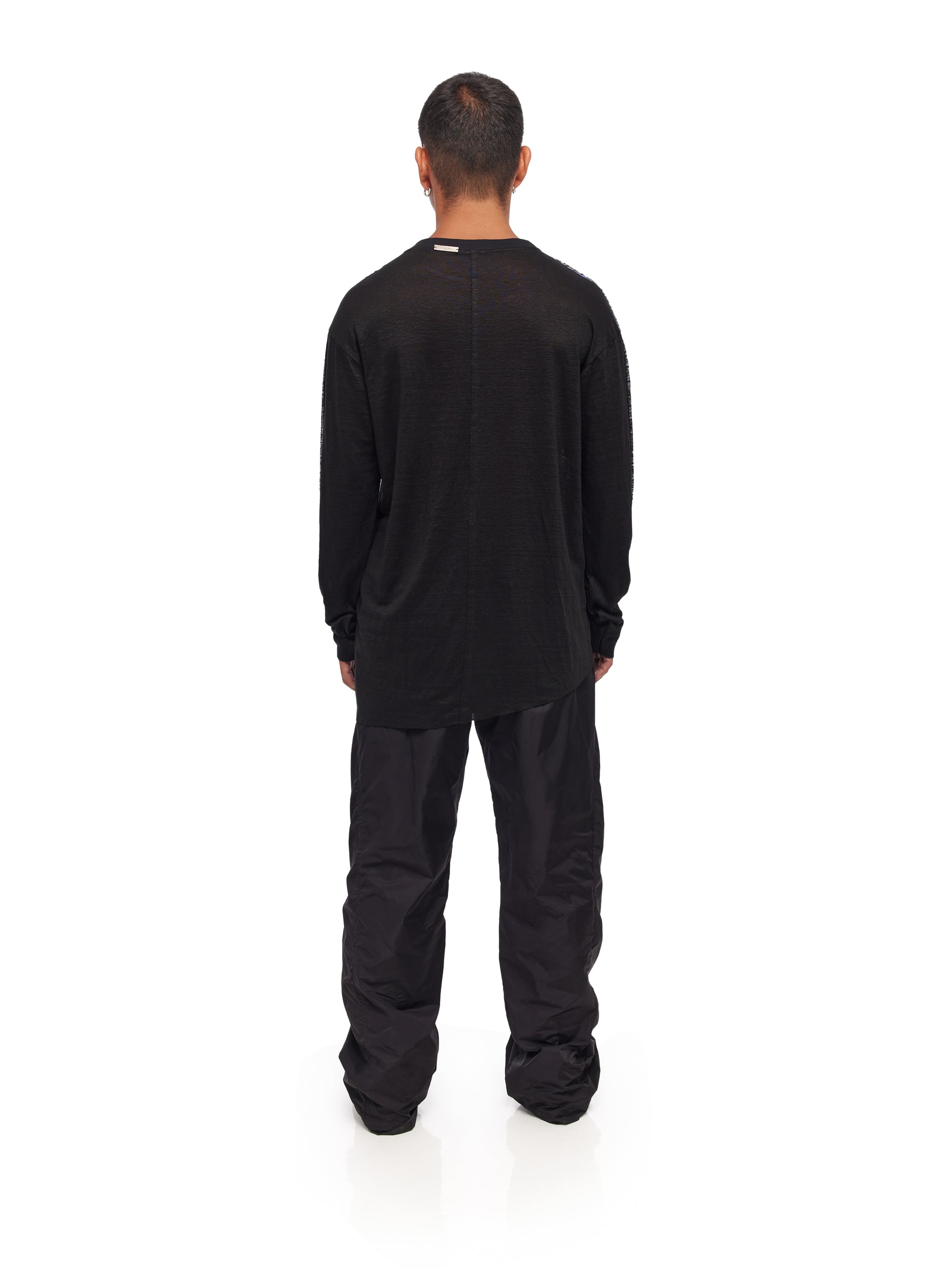 Crafted from 100% Linen, this YA|SAR long sleeve shirt exudes a raw, understated elegance with its jersey fabric that promises breathability and comfort. Available in classic black and off white, the shirt's design includes a ribbed neck that adds a touch of refined casualness. The overall look is enhanced by over stitching and unfinished detailing, providing a deliberately deconstructed aesthetic that captures a modern, edgy vibe. The back line stitch detailing adds an element of design depth, while the unfinished hems reinforce the shirt's avant-garde appeal. Metal tag detailing subtly imprints the YA|SAR signature. Male model is wearing size OS and is 180 cm tall.