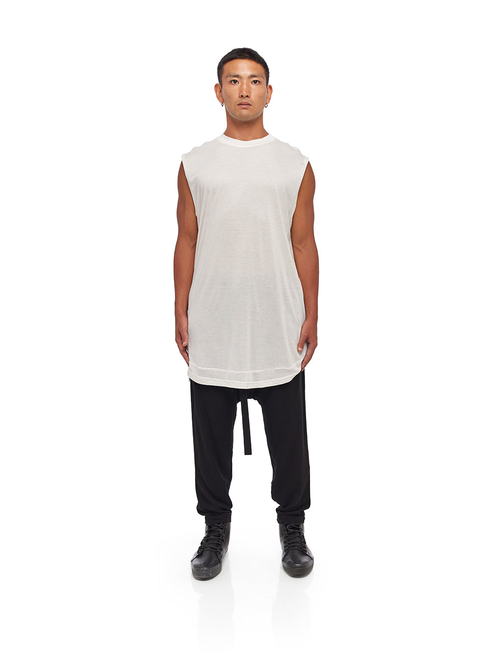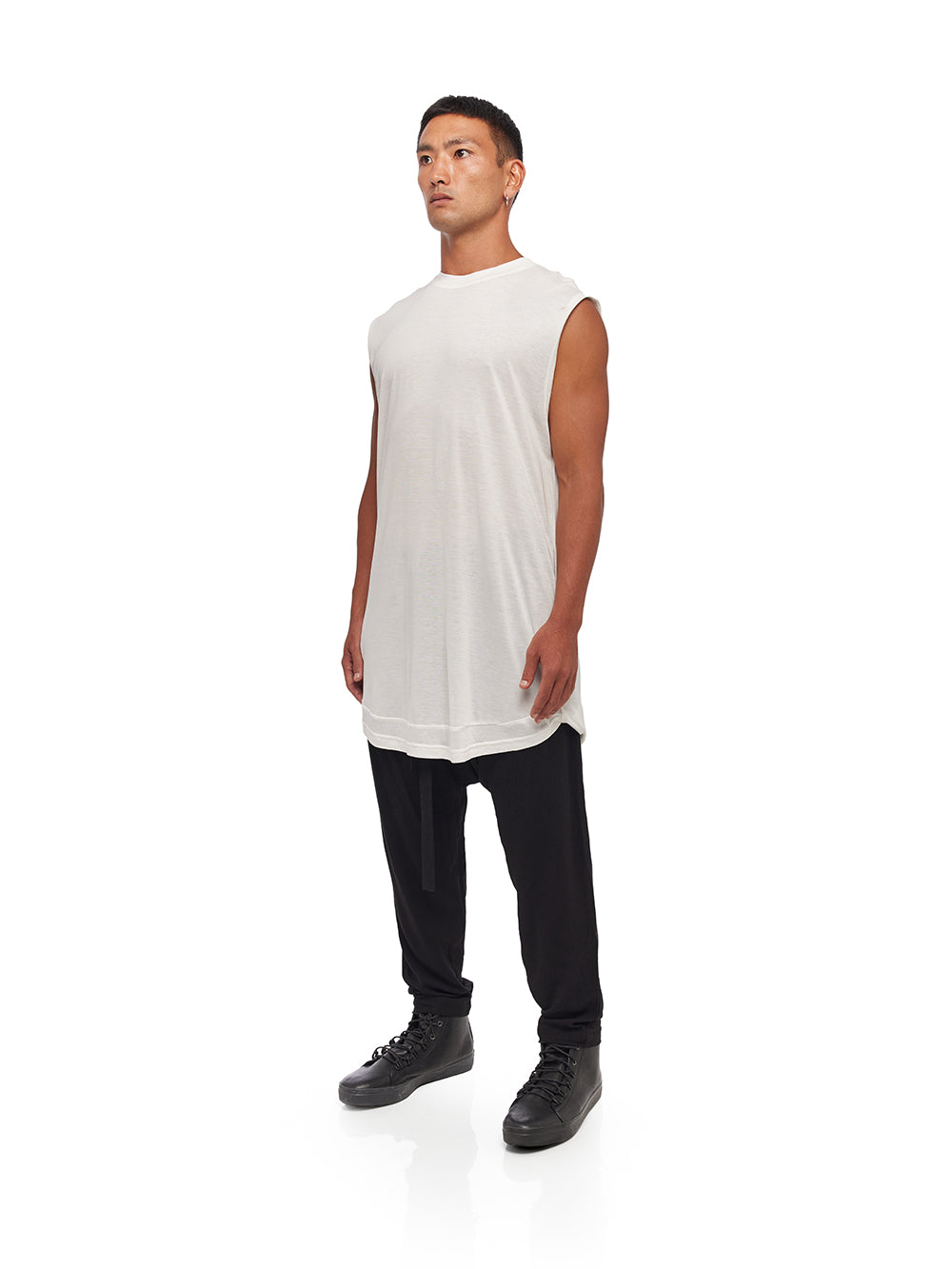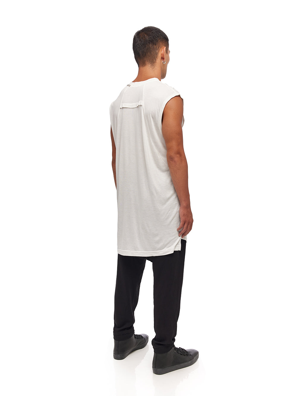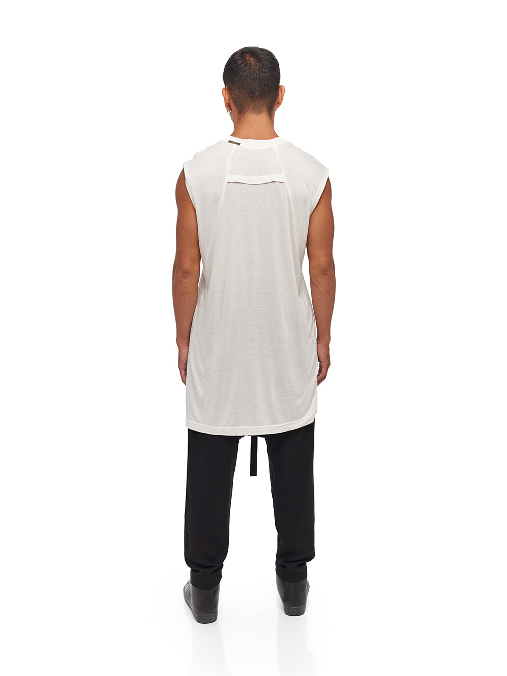 Crafted from 100% Bamboo, this YA|SAR singlet offers an eco-friendly choice without sacrificing style. Available in classic black and off white, the singlet features a ribbed neck that ensures comfort and durability. The bamboo material provides a soft, breathable quality that is perfect for sensitive skin, combining environmental consciousness with luxurious wearability. Distinctive design elements include back line stitch detailing and a stylishly extended lower part, adding a modern twist to the traditional singlet form. Metal tag detailing enhances the refined aesthetic, marking this piece as a signature YA|SAR garment. Male model is wearing size M and is 180 cm tall.