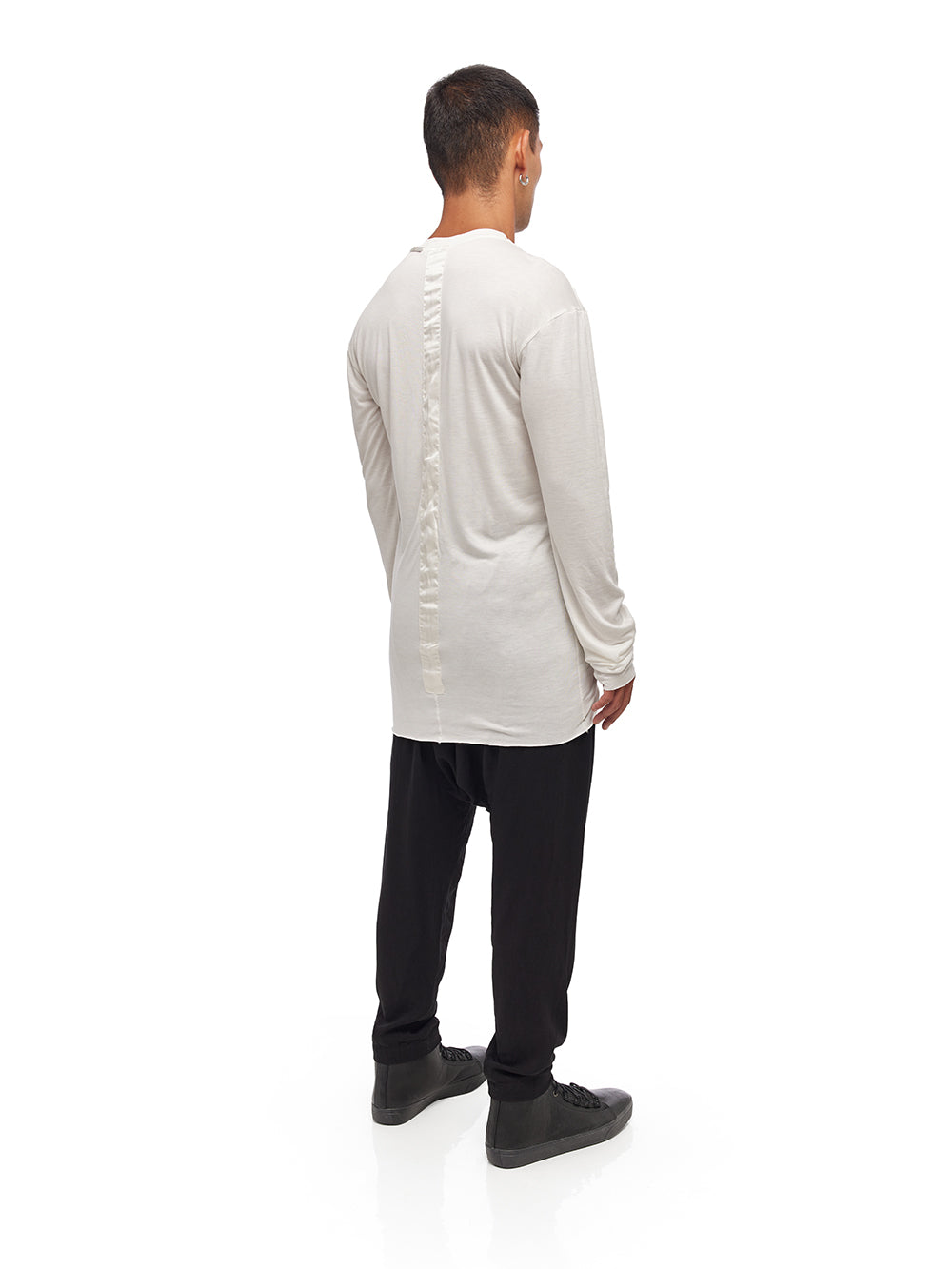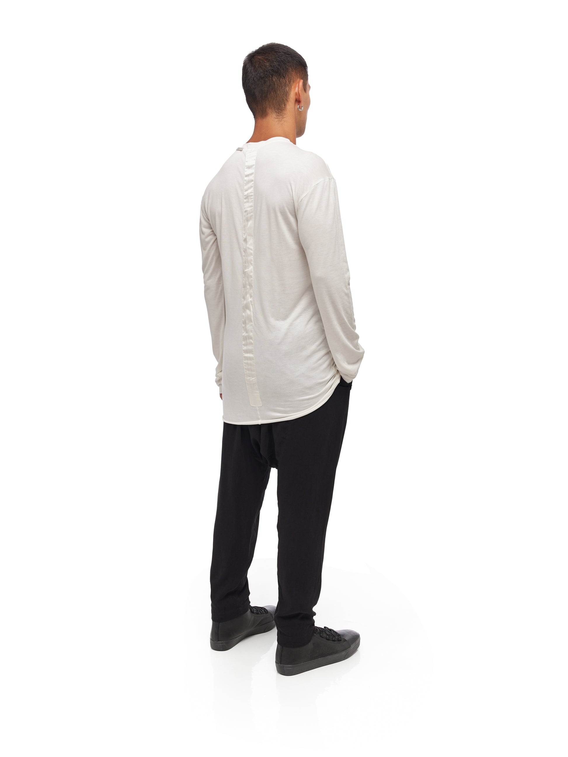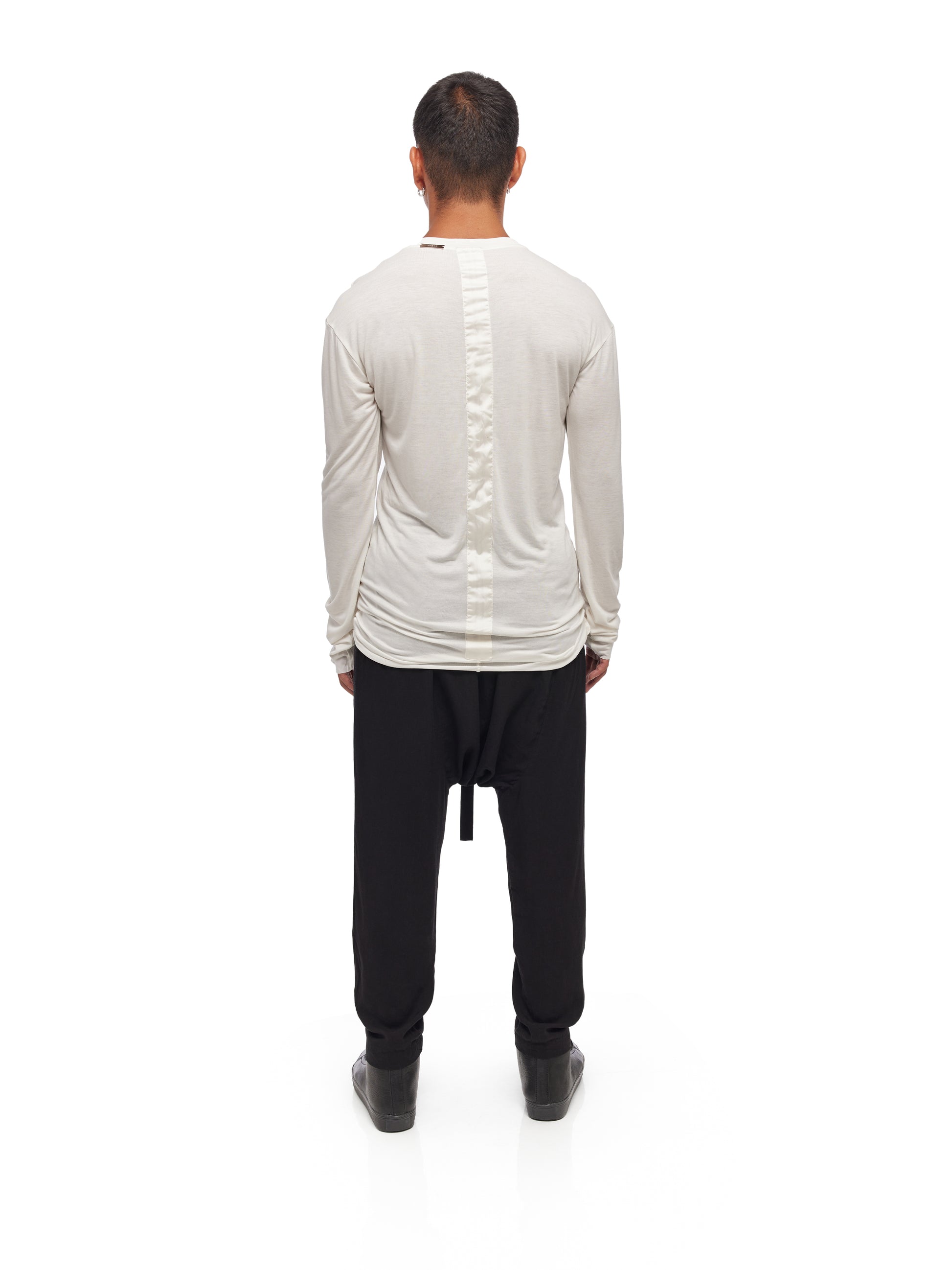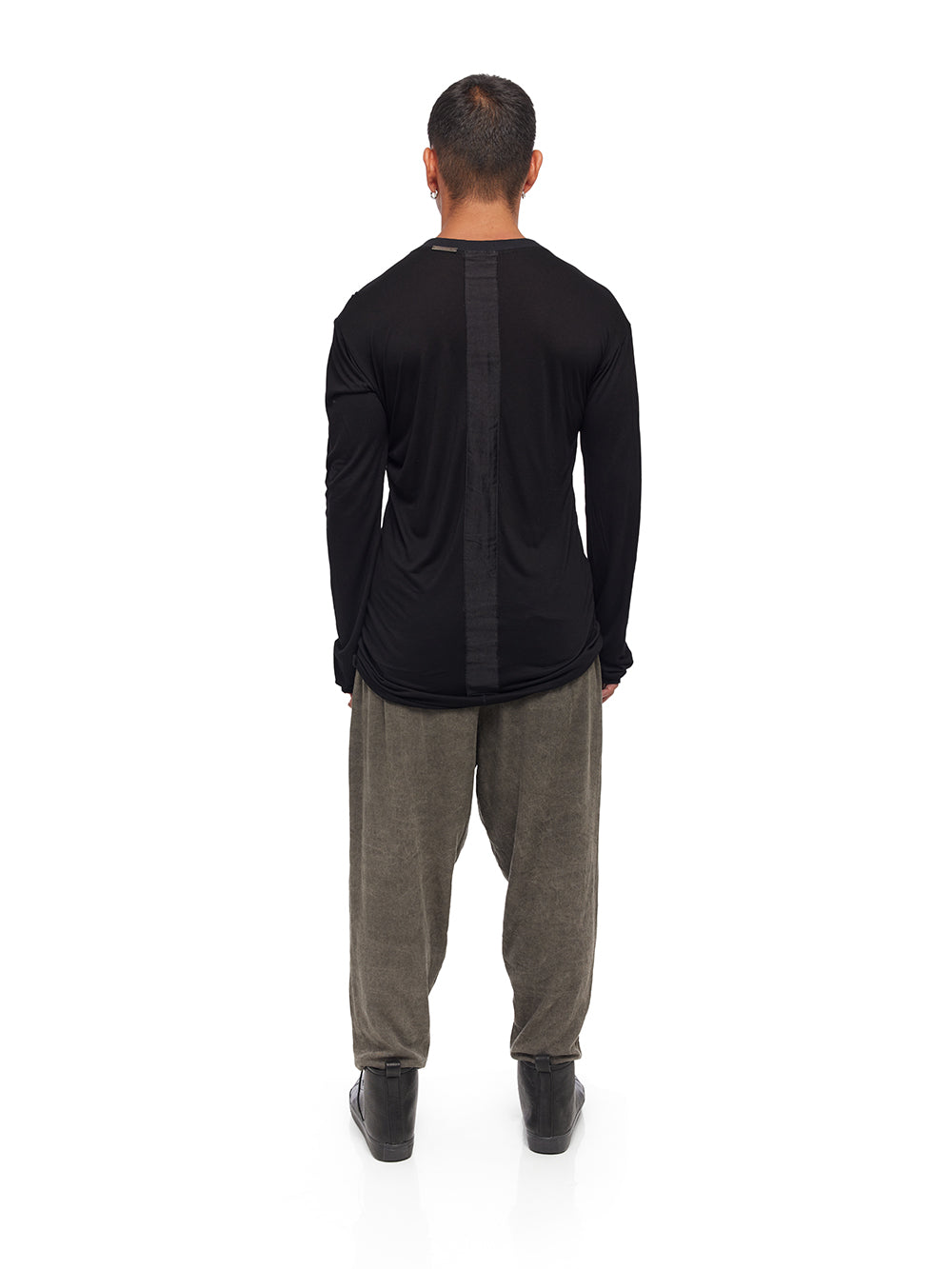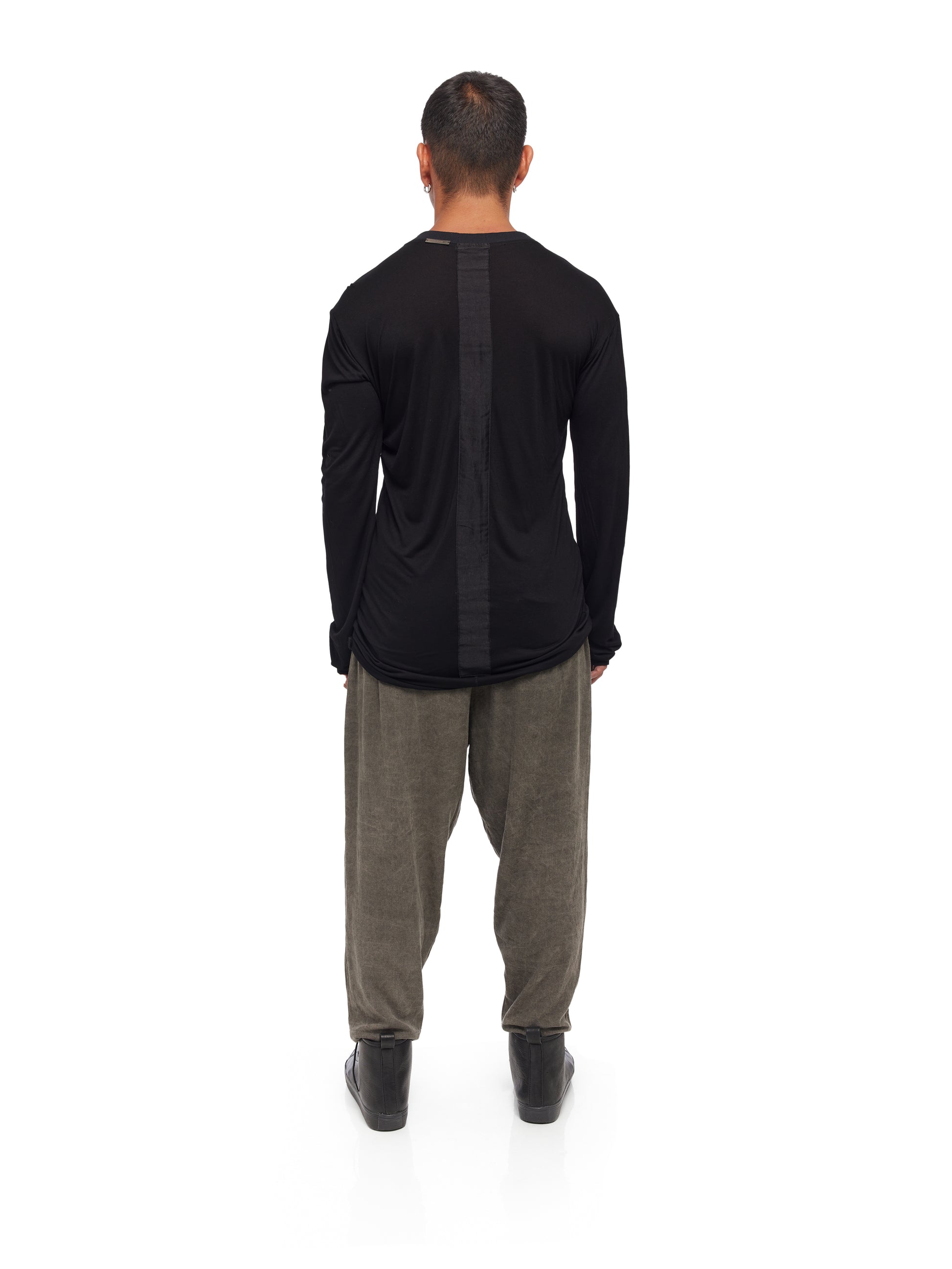 This YA|SAR Bamboo Long Sleeve Shirt marries luxurious comfort with a refined aesthetic, crafted entirely from 100% Bamboo known for its softness and sustainability. The shirt is presented in classic black with off-white accents, making it a versatile addition to any wardrobe. It features a ribbed neck and unfinished hems that enhance its relaxed, natural feel. A distinctive back line adorned with a silk stripe and scar stitch detailing adds a unique visual element that sets this piece apart. Metal tag detailing provides a subtle nod to the brand's commitment to quality and elegance. Male model is wearing size OS and is 180 cm tall.