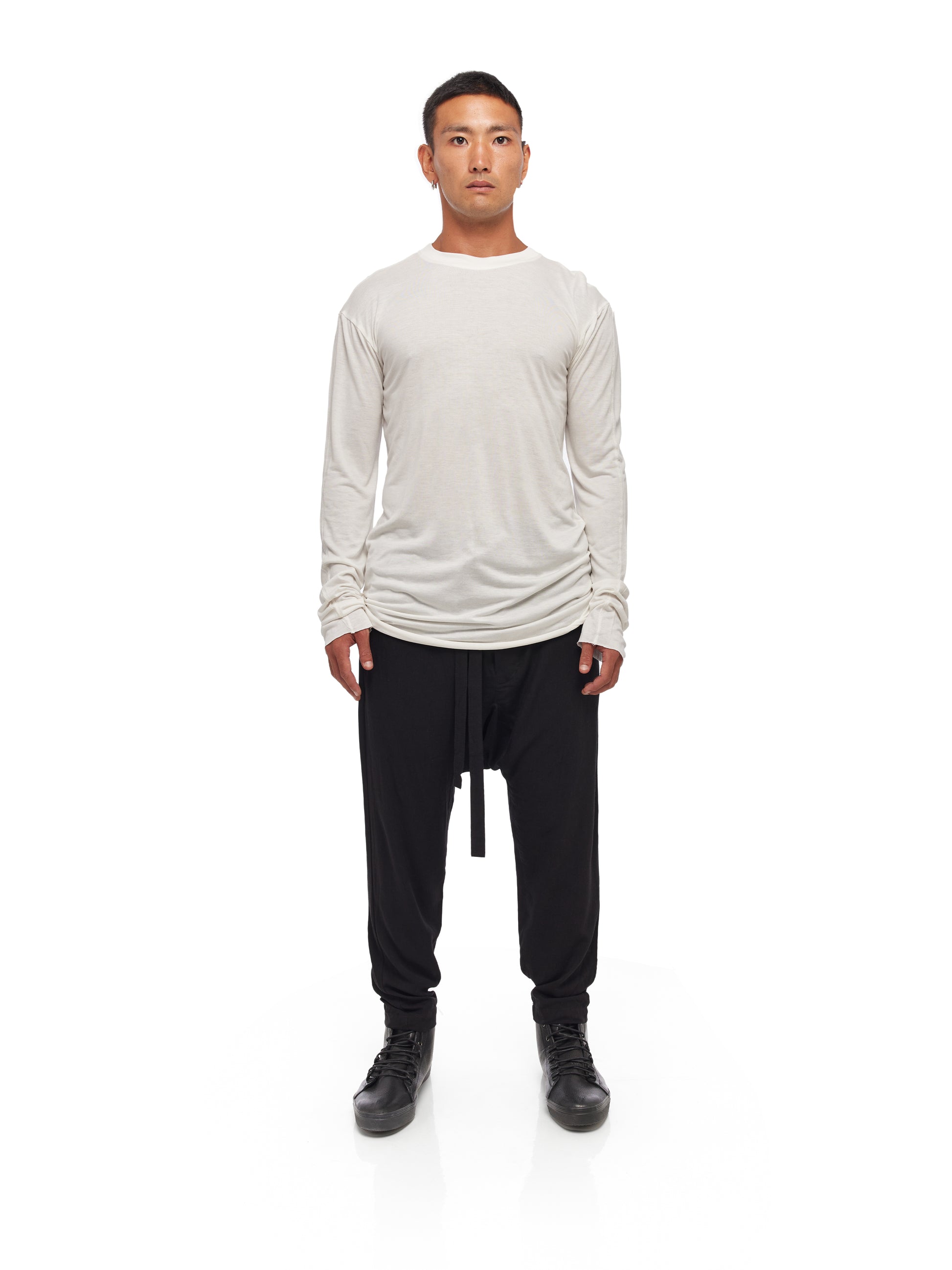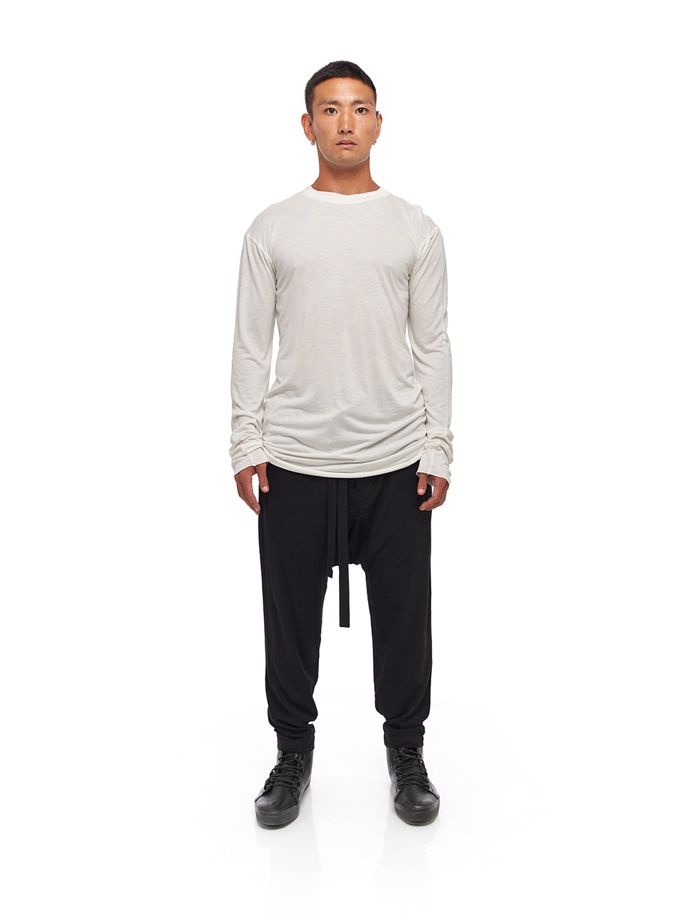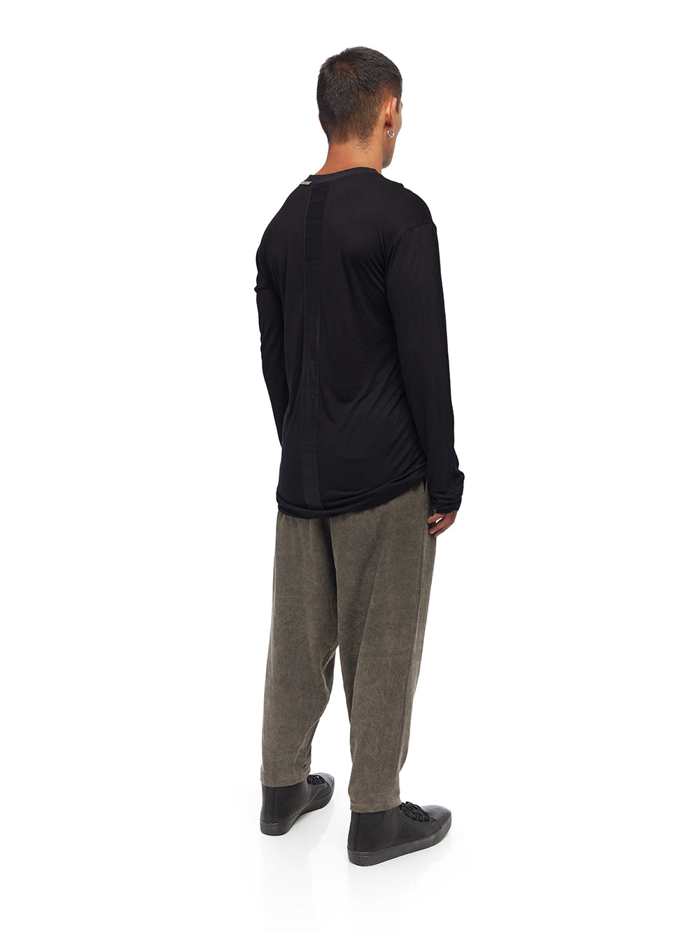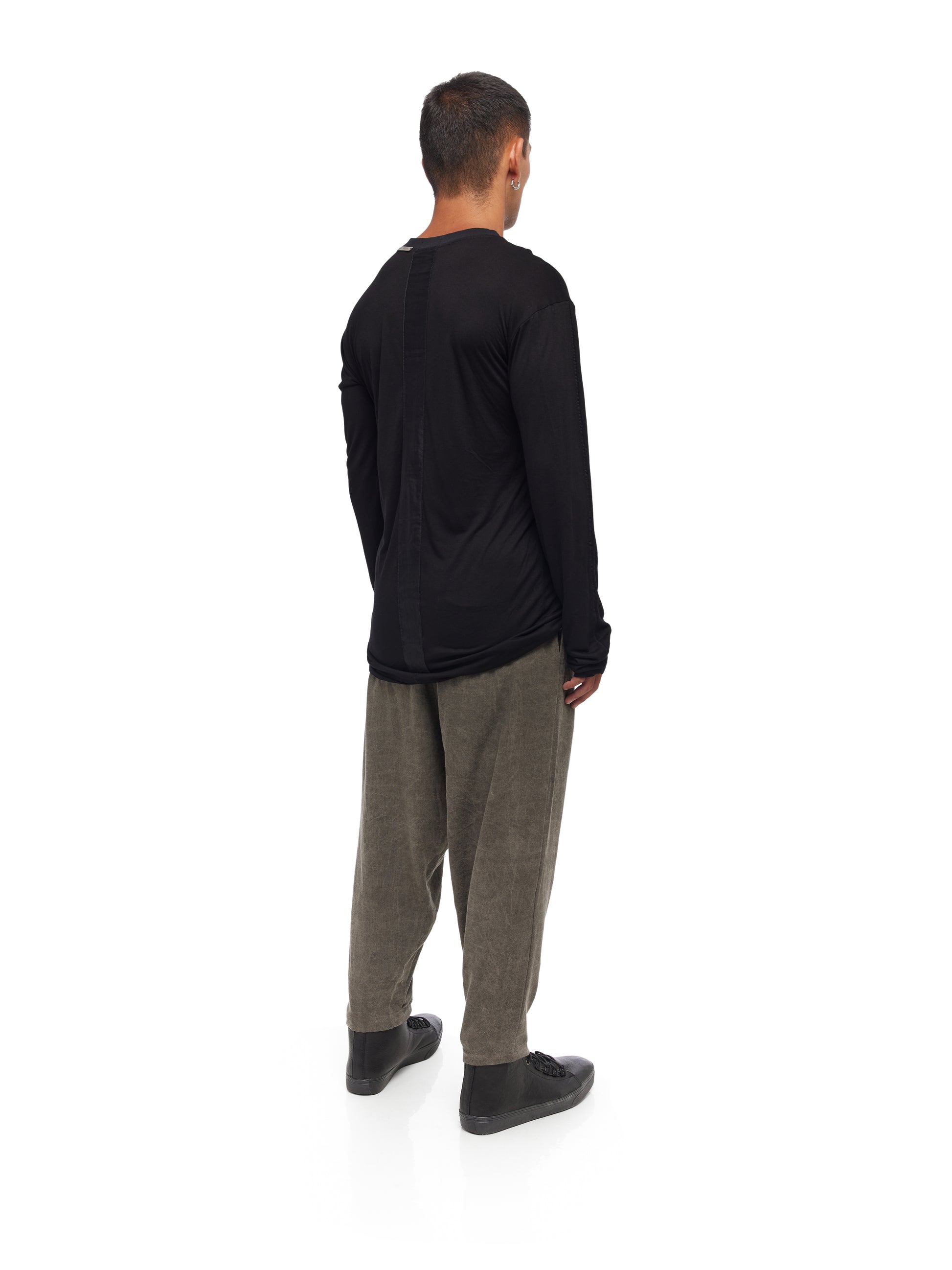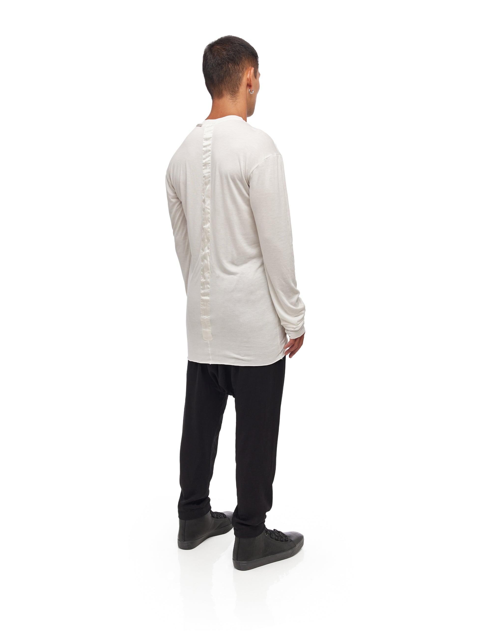 This YA|SAR Bamboo Long Sleeve Shirt marries luxurious comfort with a refined aesthetic, crafted entirely from 100% Bamboo known for its softness and sustainability. The shirt is presented in classic black with off-white accents, making it a versatile addition to any wardrobe. It features a ribbed neck and unfinished hems that enhance its relaxed, natural feel. A distinctive back line adorned with a silk stripe and scar stitch detailing adds a unique visual element that sets this piece apart. Metal tag detailing provides a subtle nod to the brand's commitment to quality and elegance. Male model is wearing size OS and is 180 cm tall.