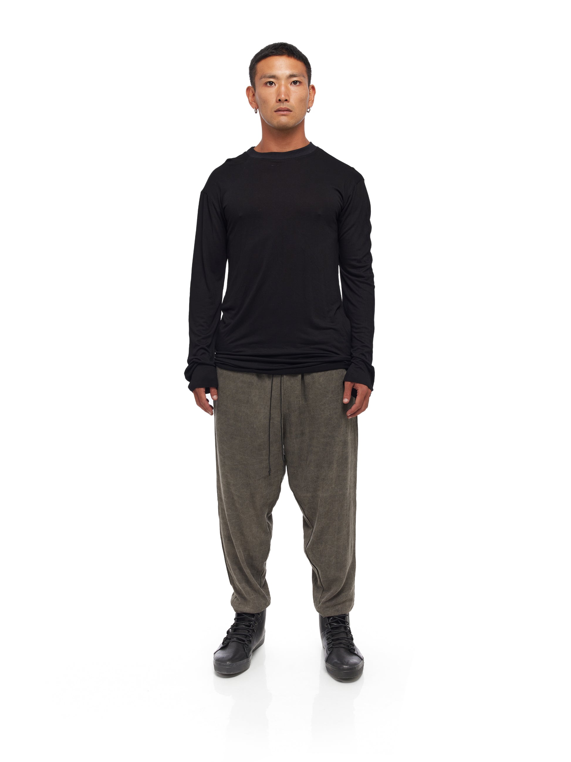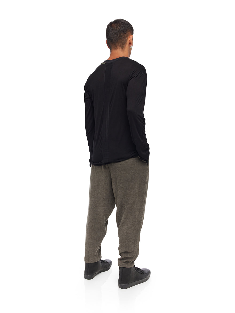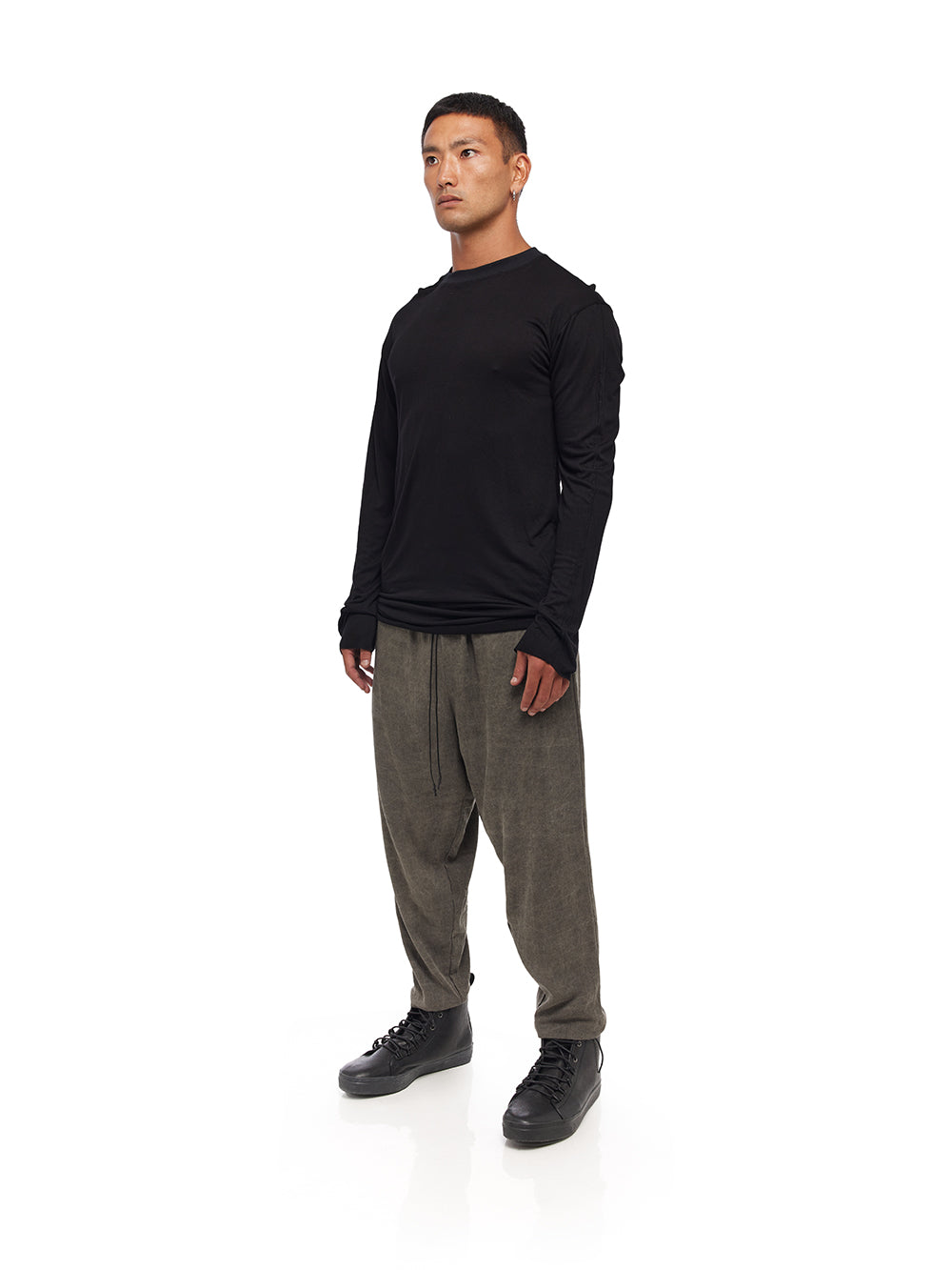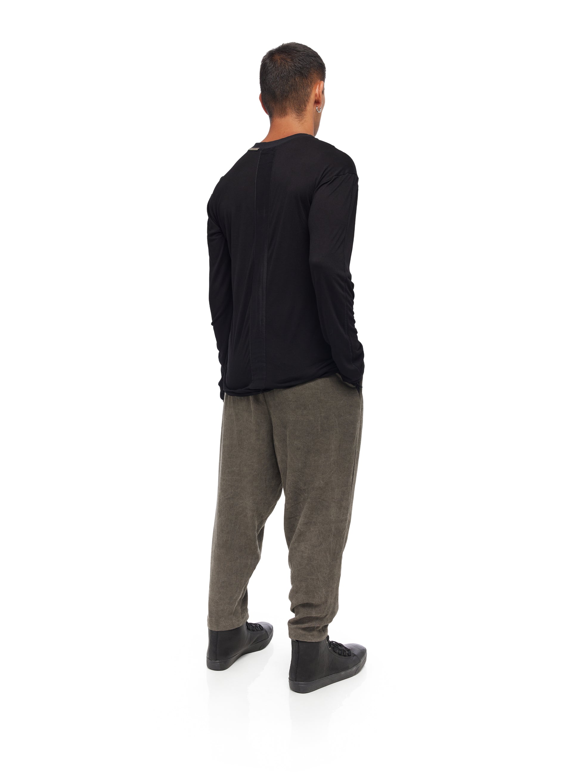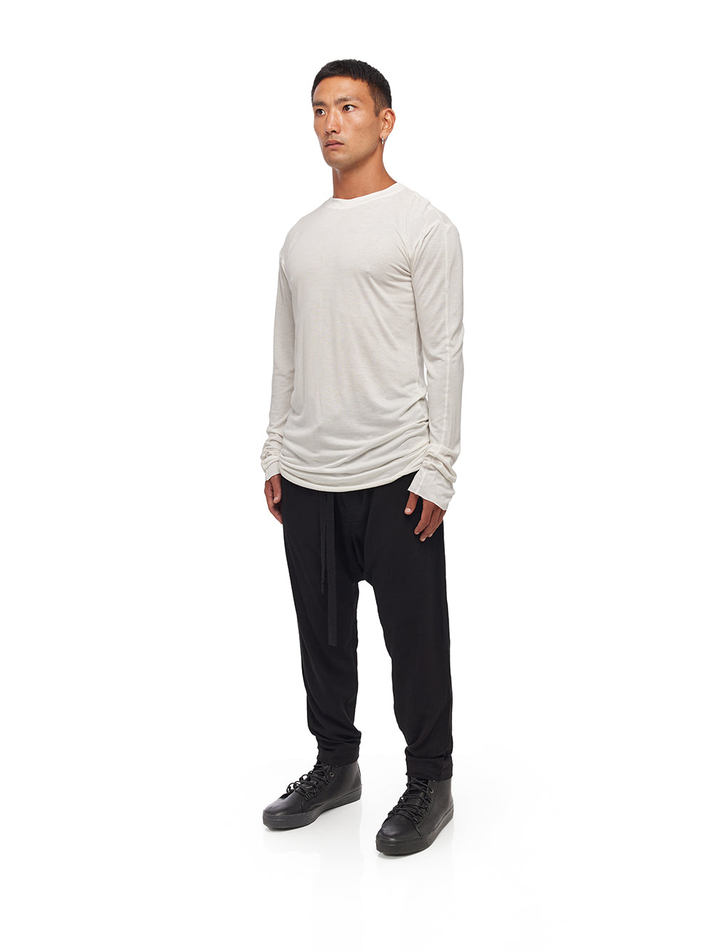 This YA|SAR Bamboo Long Sleeve Shirt marries luxurious comfort with a refined aesthetic, crafted entirely from 100% Bamboo known for its softness and sustainability. The shirt is presented in classic black with off-white accents, making it a versatile addition to any wardrobe. It features a ribbed neck and unfinished hems that enhance its relaxed, natural feel. A distinctive back line adorned with a silk stripe and scar stitch detailing adds a unique visual element that sets this piece apart. Metal tag detailing provides a subtle nod to the brand's commitment to quality and elegance. Male model is wearing size OS and is 180 cm tall.