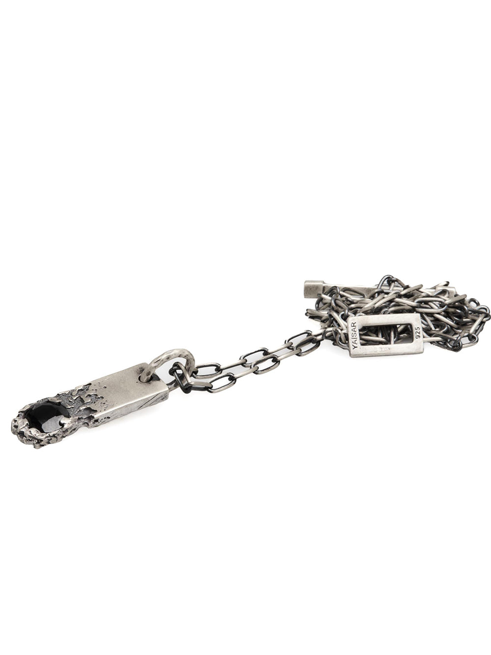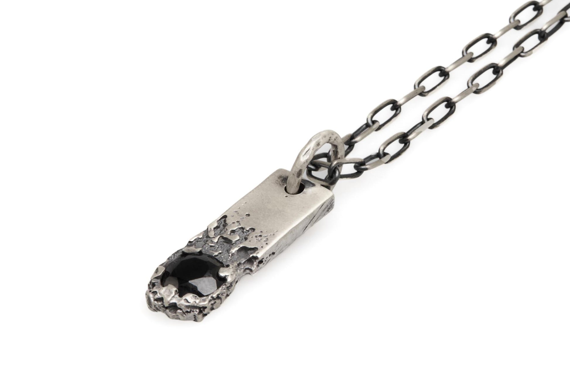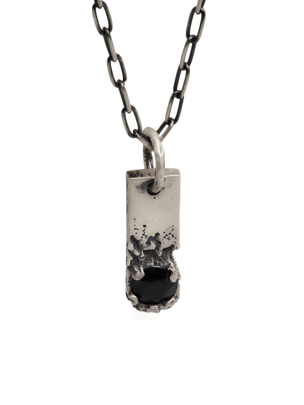 Designed in oxidized silver, this necklace features a bold black onyx spinal stone set in a rugged pendant.