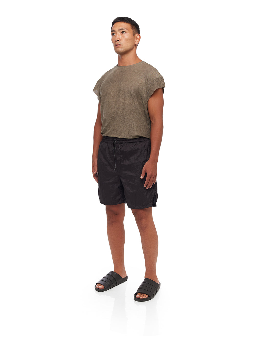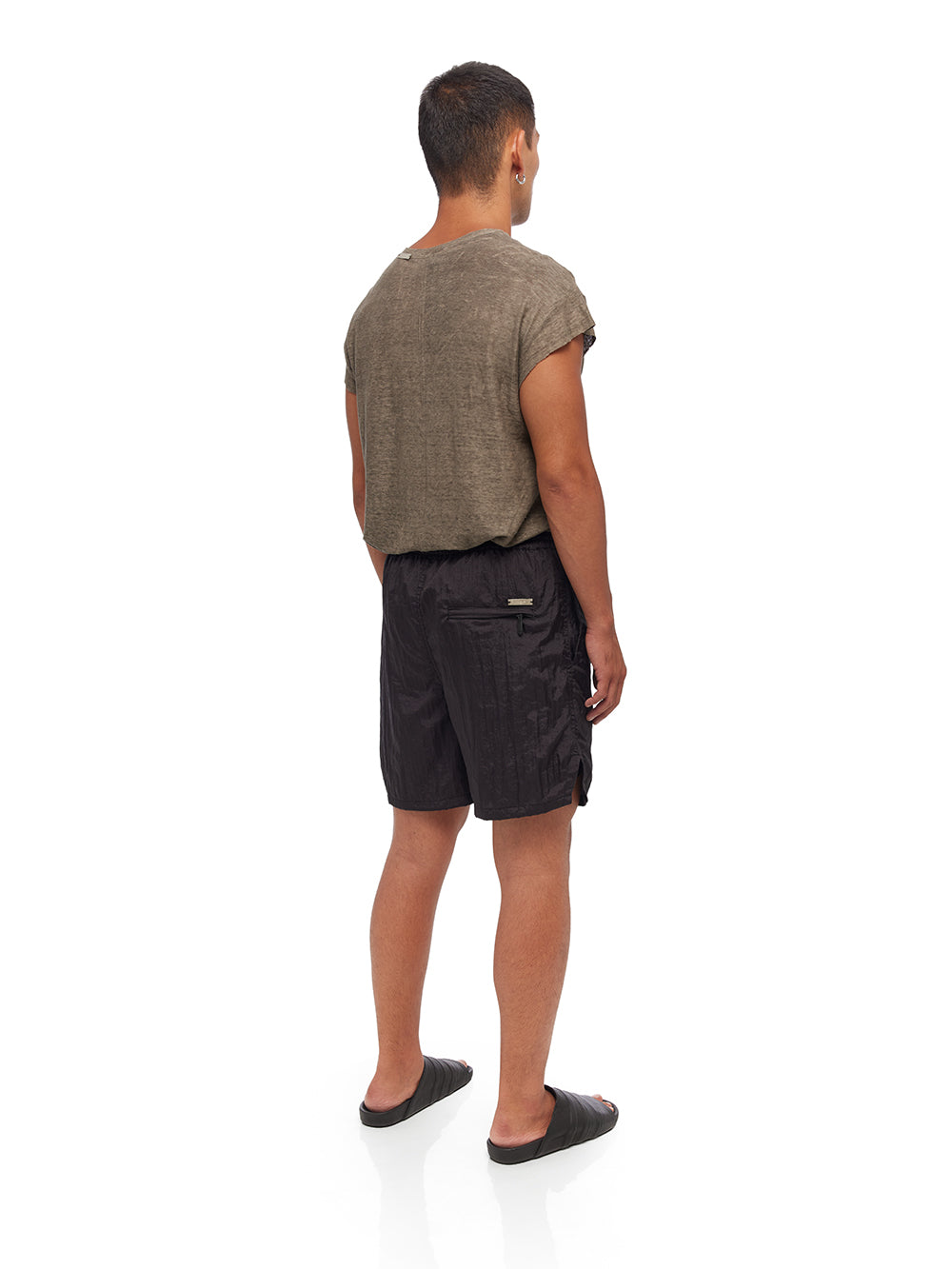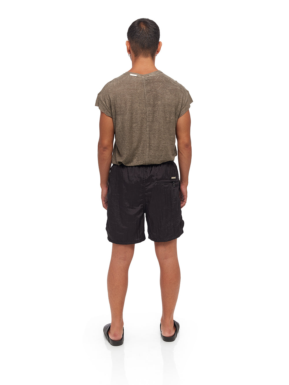 Unveil a touch of luxury with the YA|SAR Black Parachute Shorts, meticulously crafted from 100% Parachute material, presenting a perfect blend of sophistication and durability. These shorts feature an exclusive black and gold color combination that radiates a luxe appeal, ideal for those who value style and functionality. The elasticized waistband ensures a comfortable fit, while the drawstring allows for easy adjustments. Practicality meets chic with metal tag detailing, two convenient side pockets for essentials, and a secure back zipped pocket, enhancing both style and utility. Male model is wearing size M and is 180 cm tall. |
