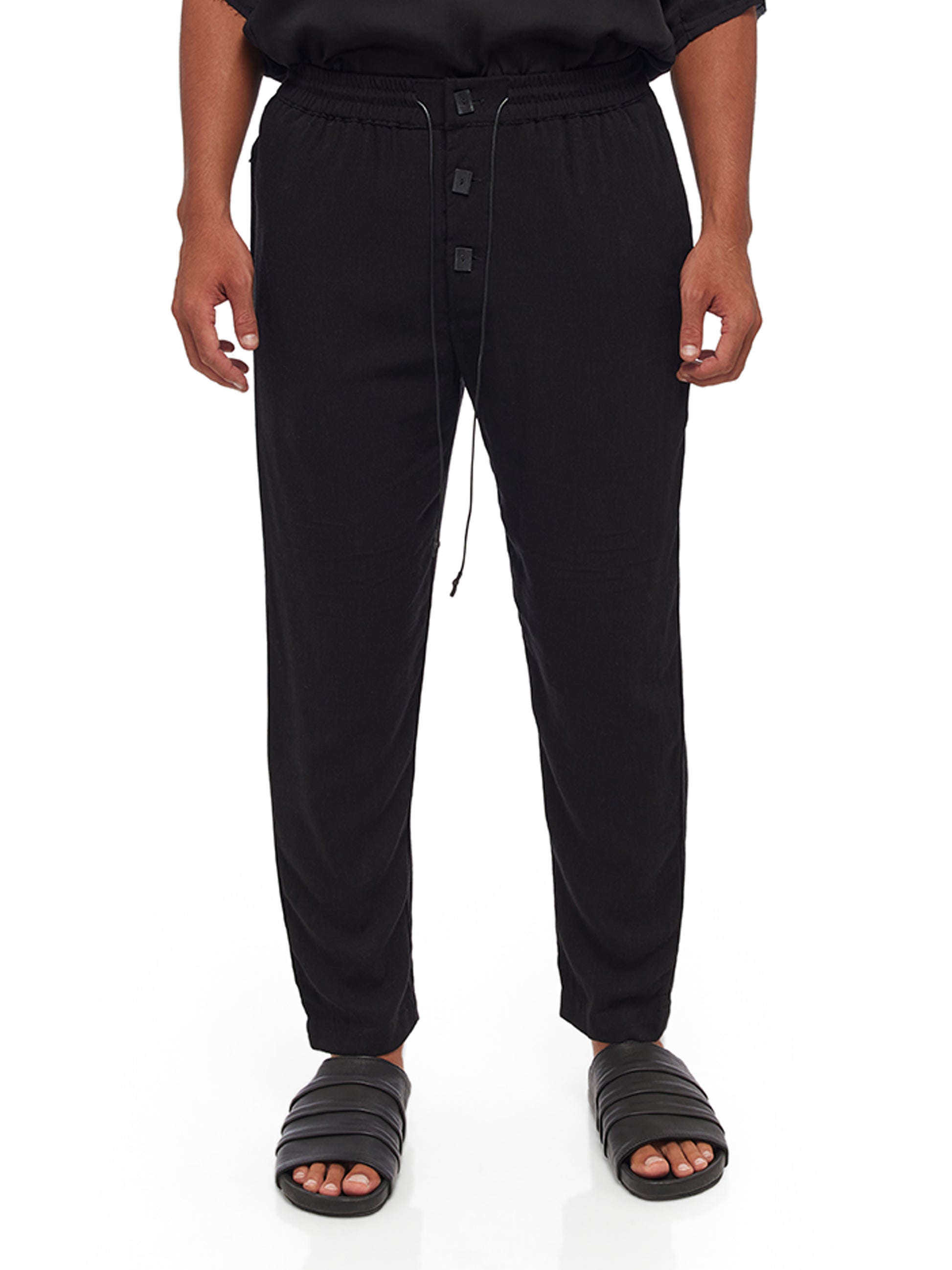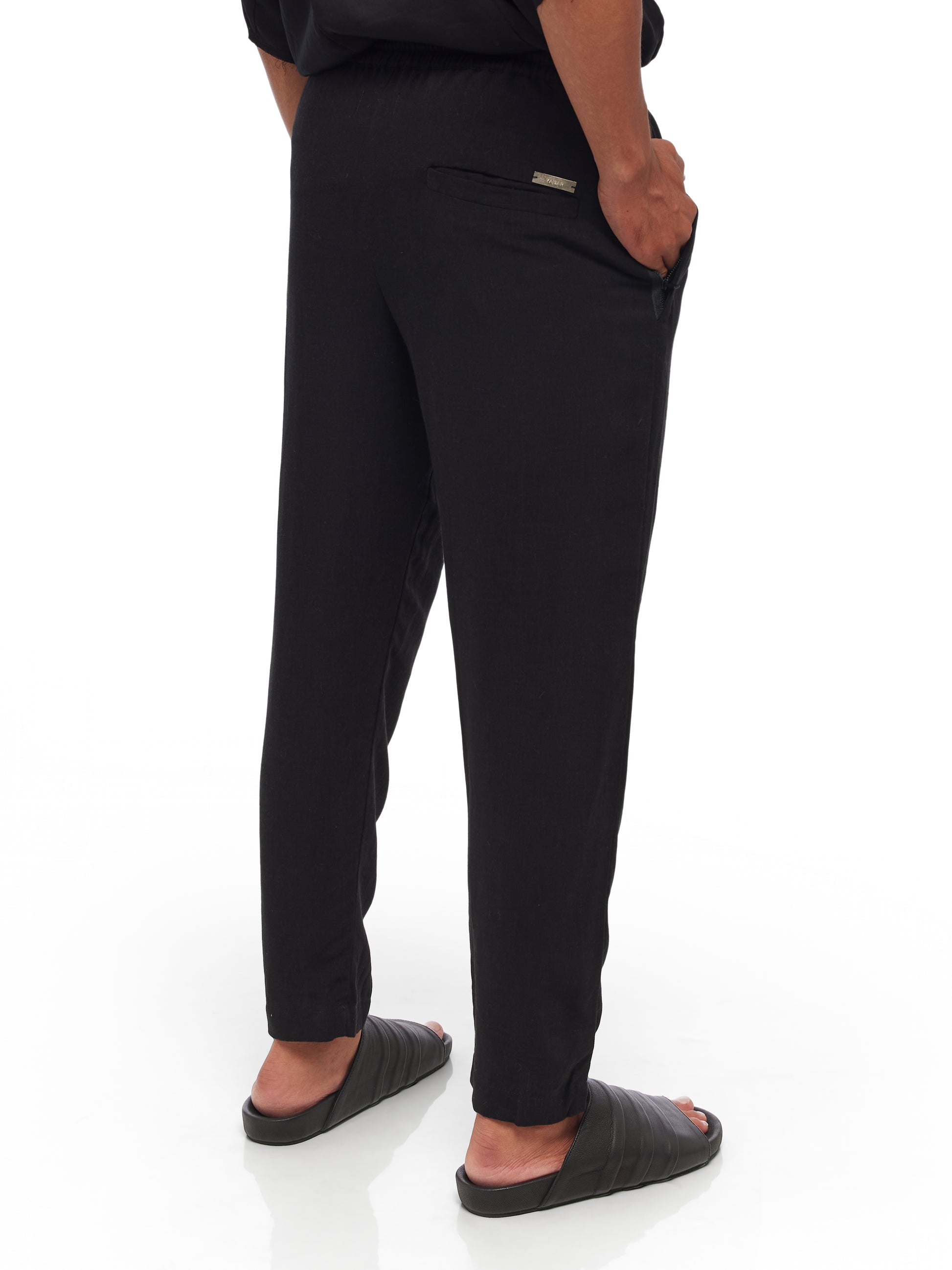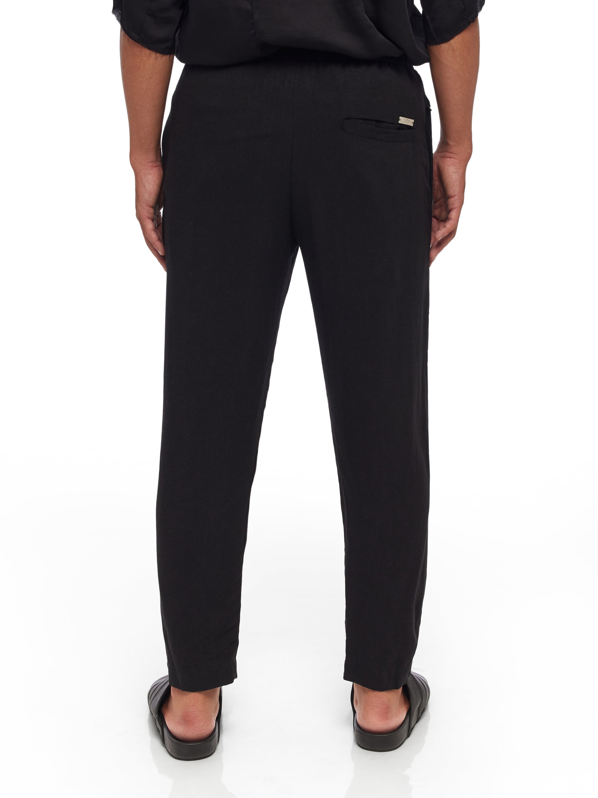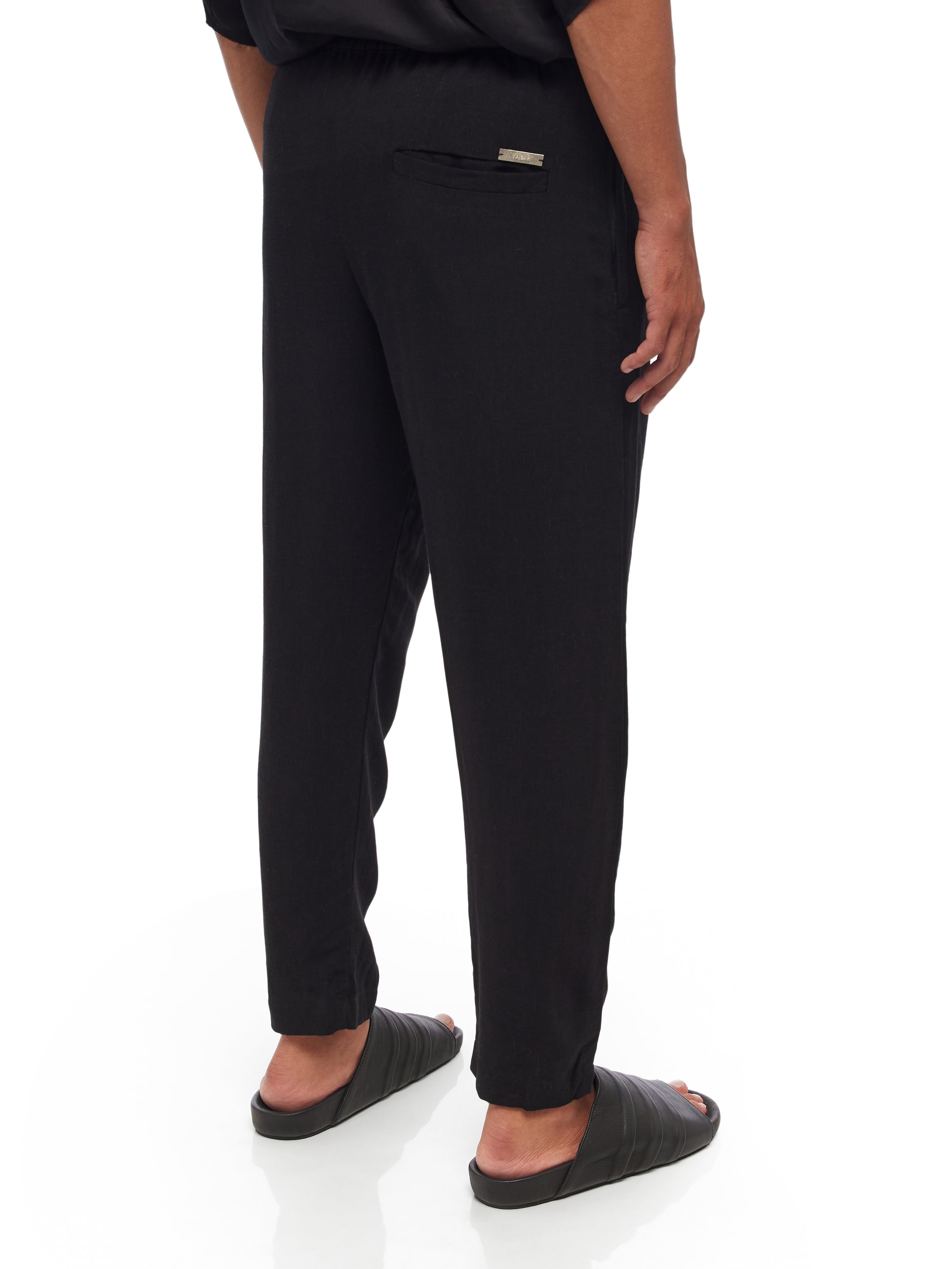 Crafted with a sophisticated blend of 55% Rayon and 45% Linen, these YA|SAR pants combine the fluidity of rayon with the strength and breathability of linen, making them a perfect choice for both comfort and style. Featuring an elasticized waistband with a drawstring, these pants offer a custom fit that adapts seamlessly to the wearer's body. The front button closure adds a classic touch, while the inclusion of two side pockets and one back pocket provides practical storage solutions for everyday essentials. Metal tag detailing subtly accentuates the garment, lending an air of luxury to this otherwise understated piece. Male model is wearing size M and is 180 cm tall.