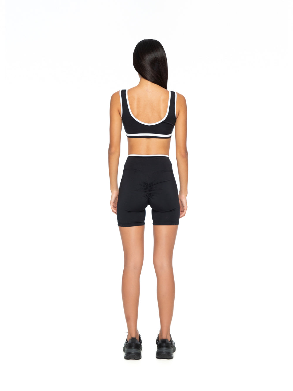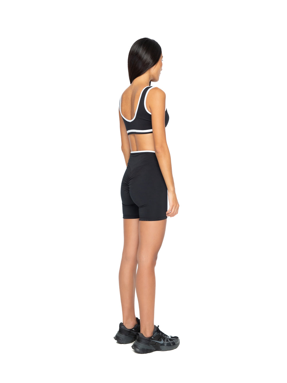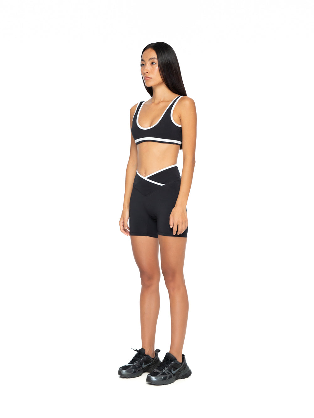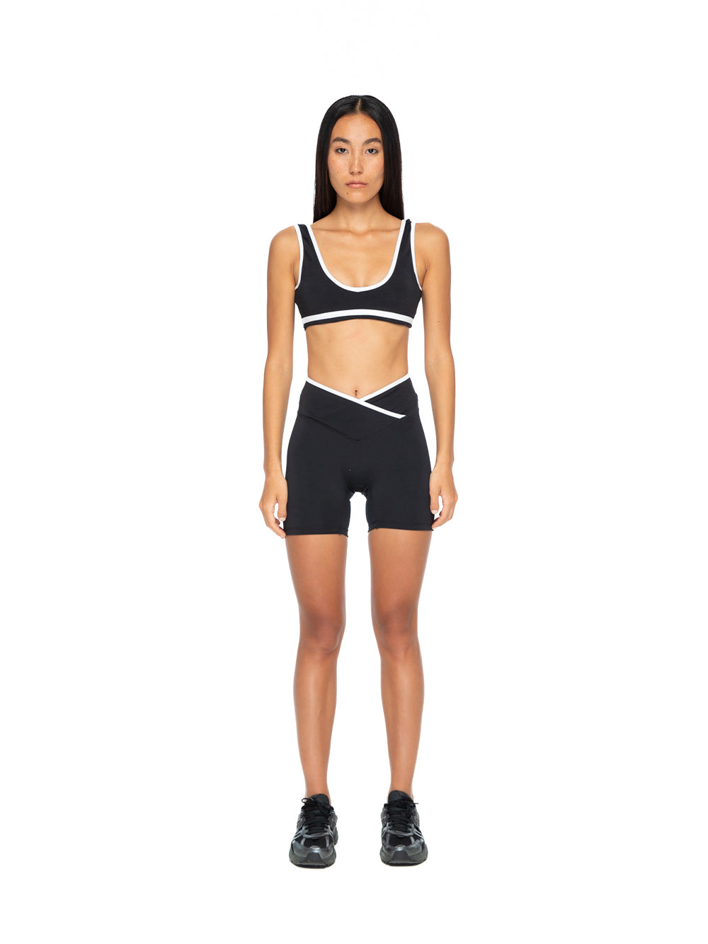 Sleek and functional, the Contrast Edge High-Waist Biker Shorts are designed to move with you. These shorts feature a crisscross waistband for a flattering, sculpted look and white piping accents that create a sharp contrast against the black fabric. The high-waisted design provides gentle compression and core support, making them perfect for intense workouts or casual outings. Made from stretchy, moisture-wicking material, these shorts ensure ultimate comfort and style. Made from 80% Polyester, and 20% Spandex. Woman model is wearing size S and is 178 cm tall.