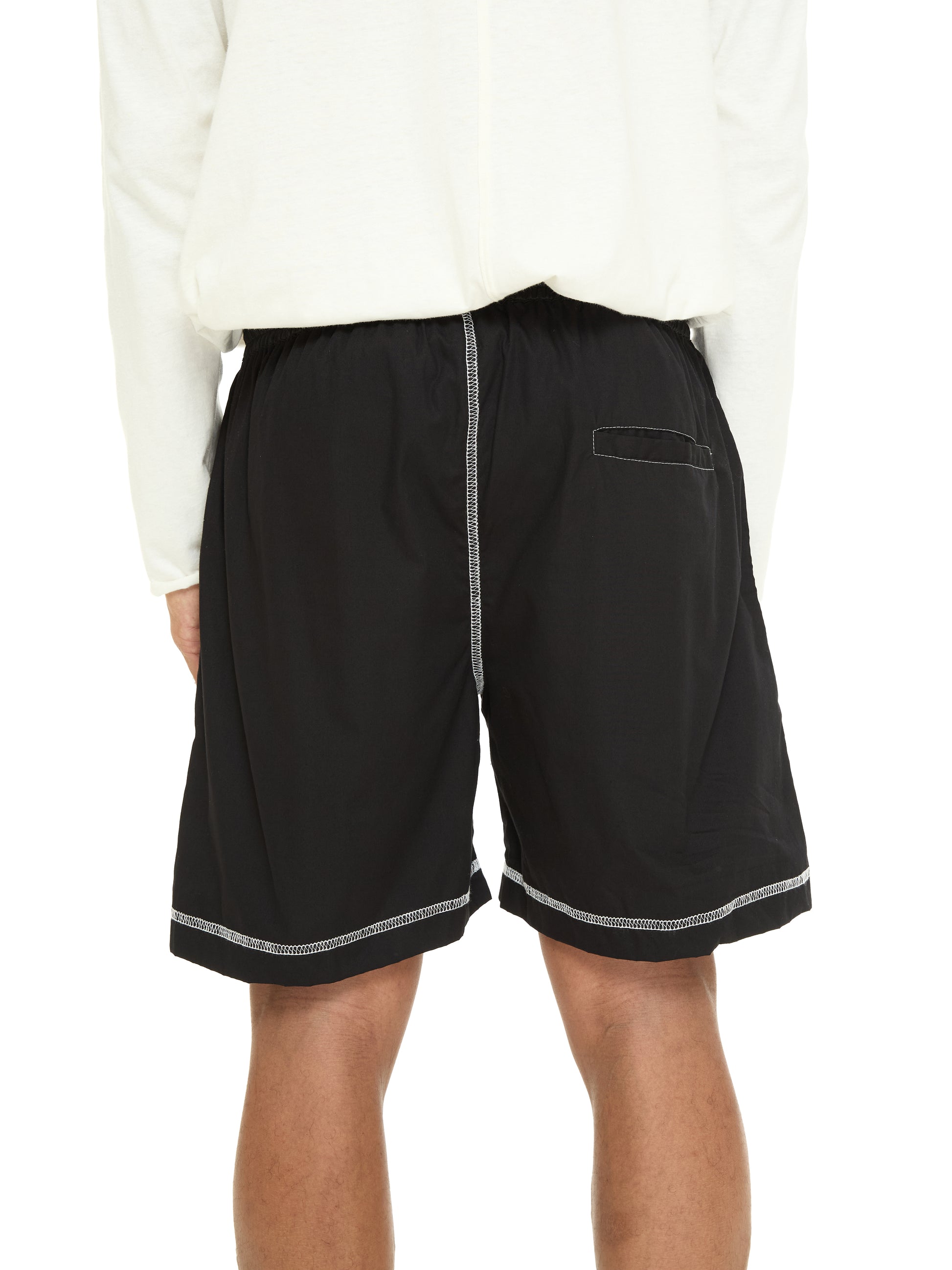 Featuring a twisted cotton drawstring and elasticated waist, the shorts provide an adjustable, easy fit. Exposed contrast stitching along the side seams and hem creates a clean, graphic detail, while the back patch pocket adds quiet functionality. A versatile piece that balances comfort with understated structure.