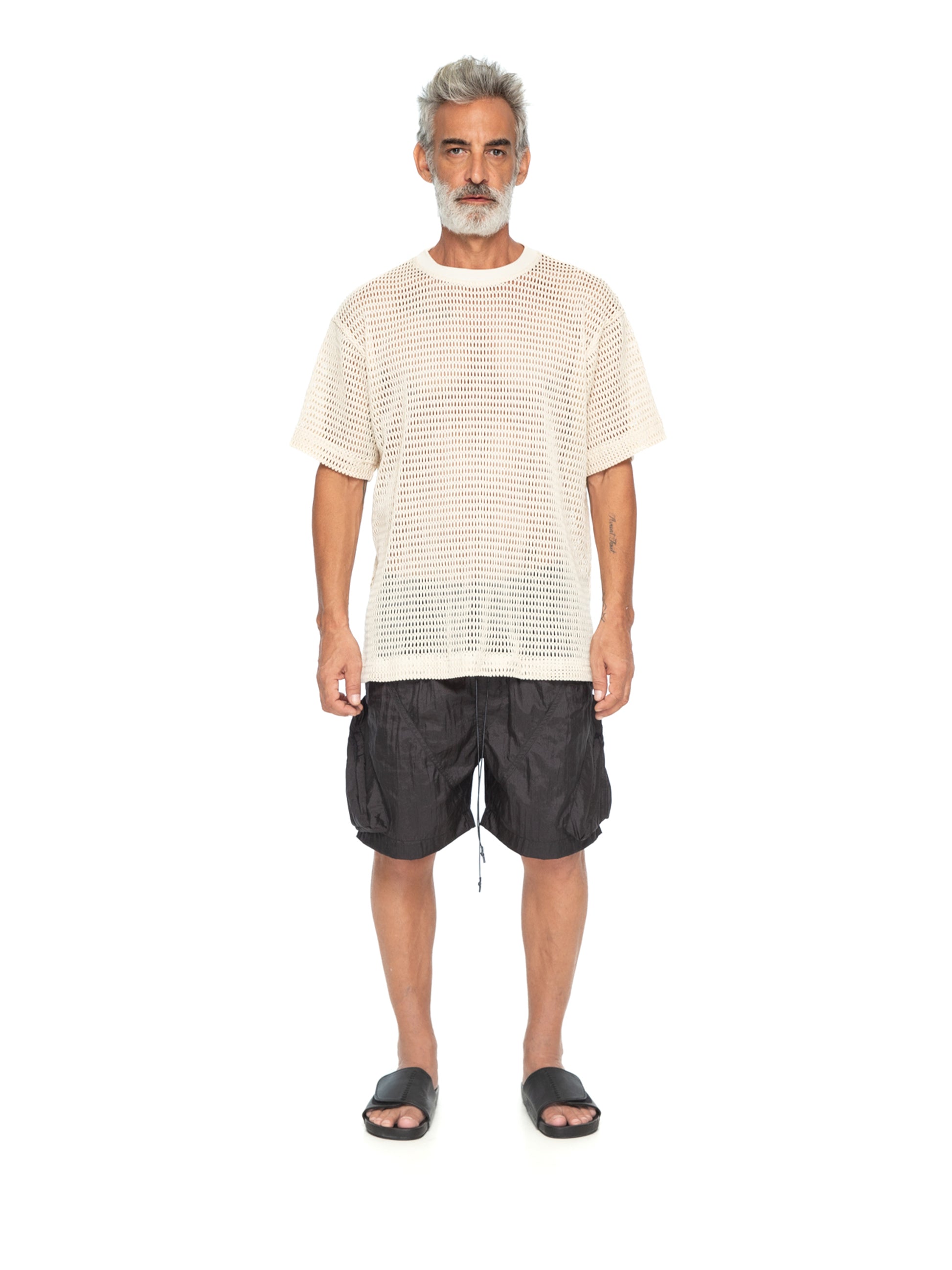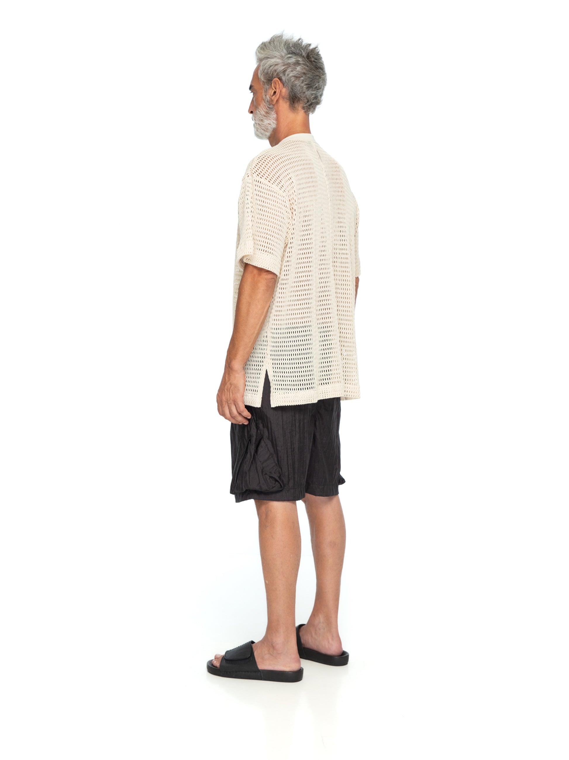 The Classic Mesh Tee is ideal for layering over a tank top or pairing with relaxed shorts for a casual yet elevated look. Its lightweight design makes it perfect for warm-weather outings or as a stylish statement in contemporary wardrobes. A must-have for those who prioritize comfort and sophistication. Male model is wearing size M and is 180 cm tall.