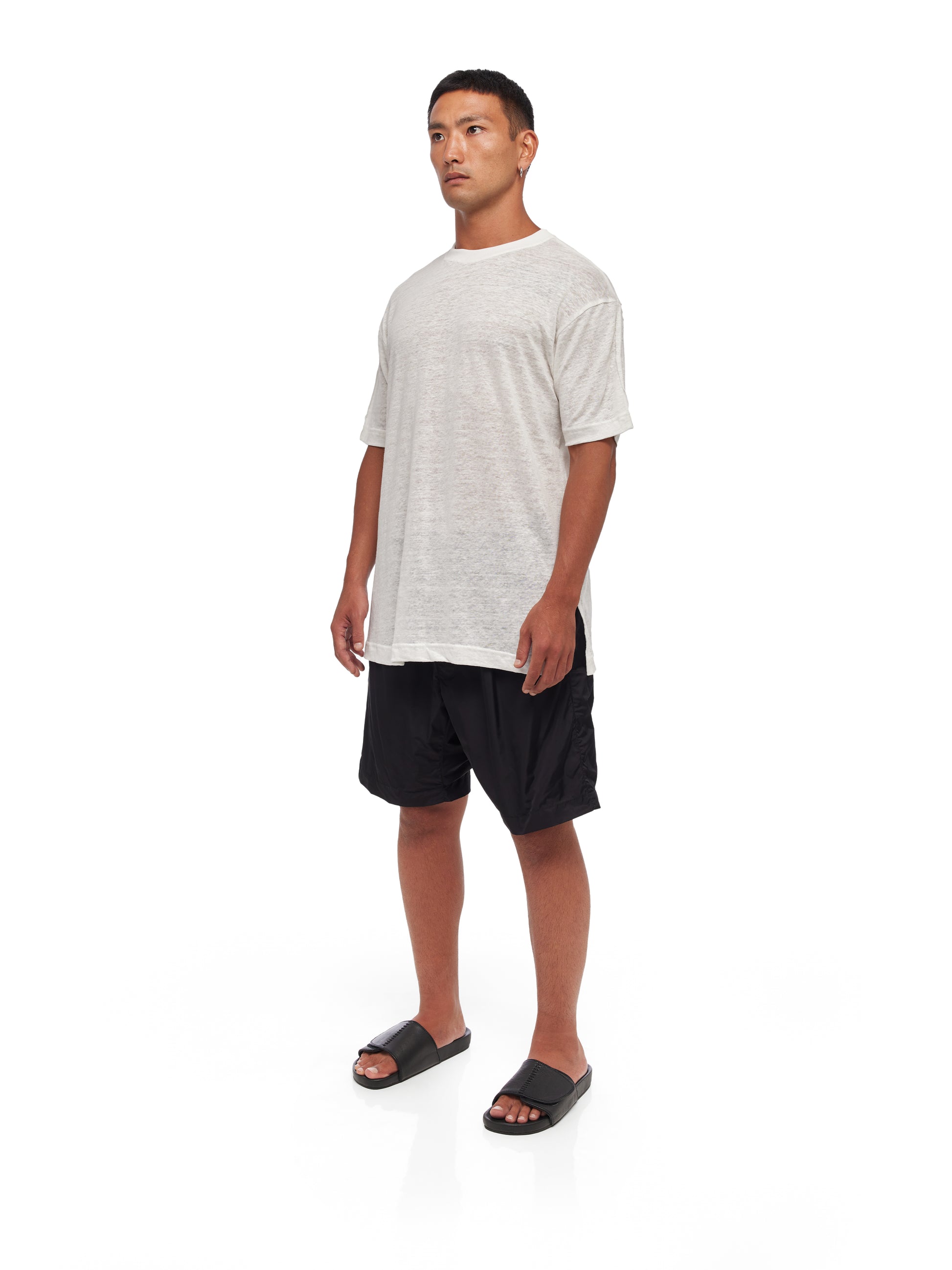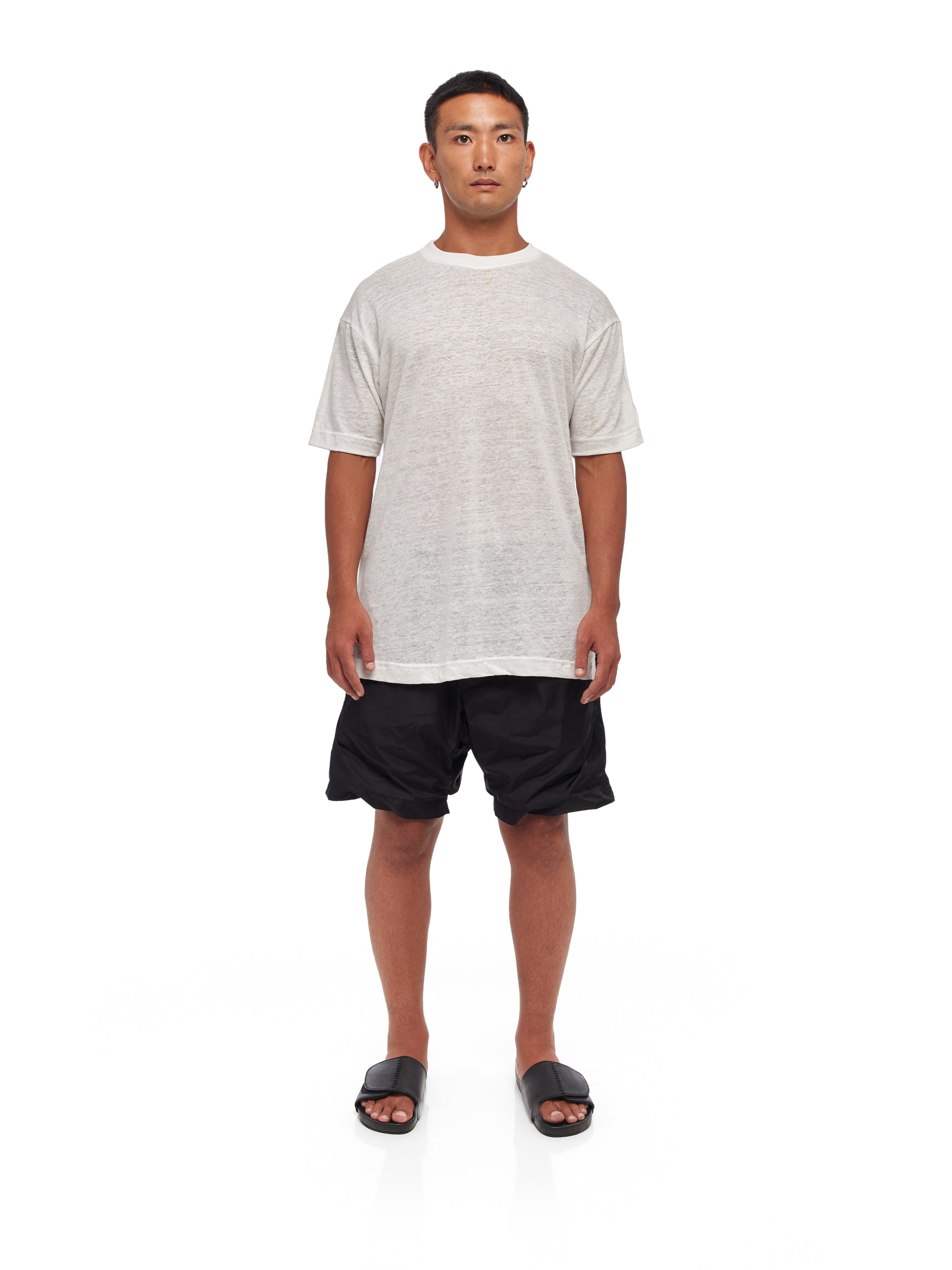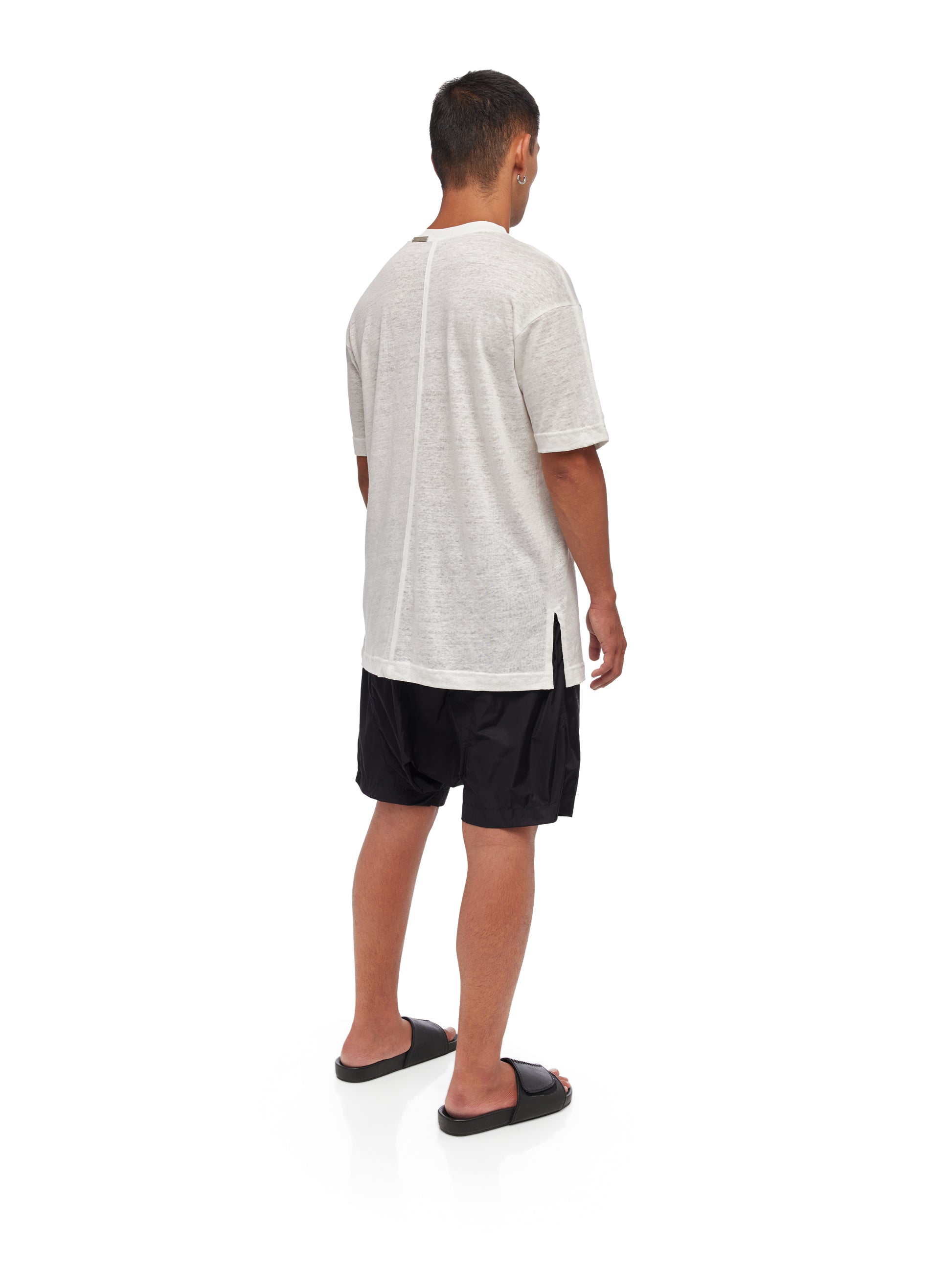 Effortless style that transitions from day to night. Pair it with tailored trousers for a refined edge or cargo pants for a contemporary urban look. The Square Linen Tee ensures comfort without compromising on sophistication. Male model is wearing size M and is 180 cm tall.