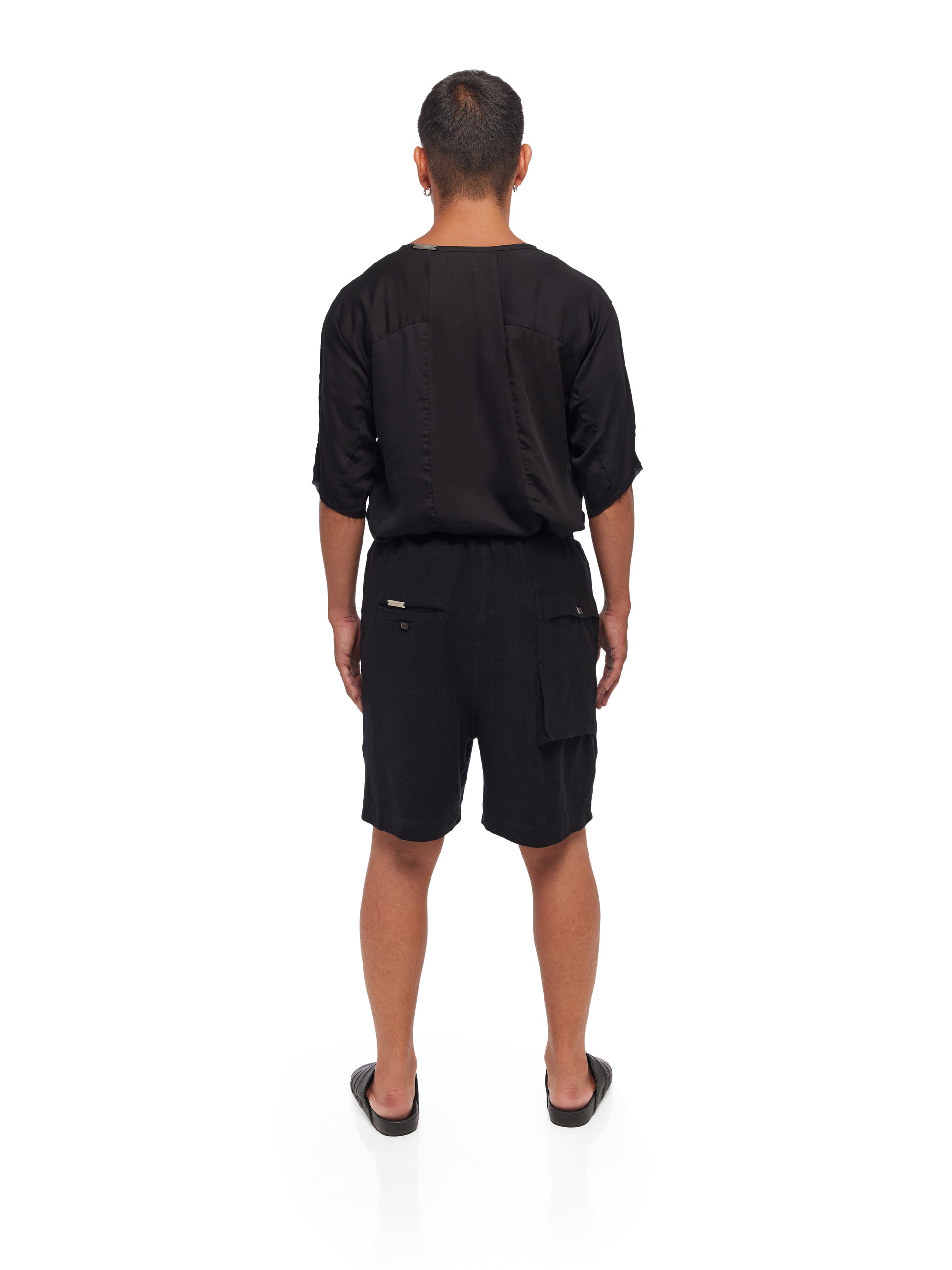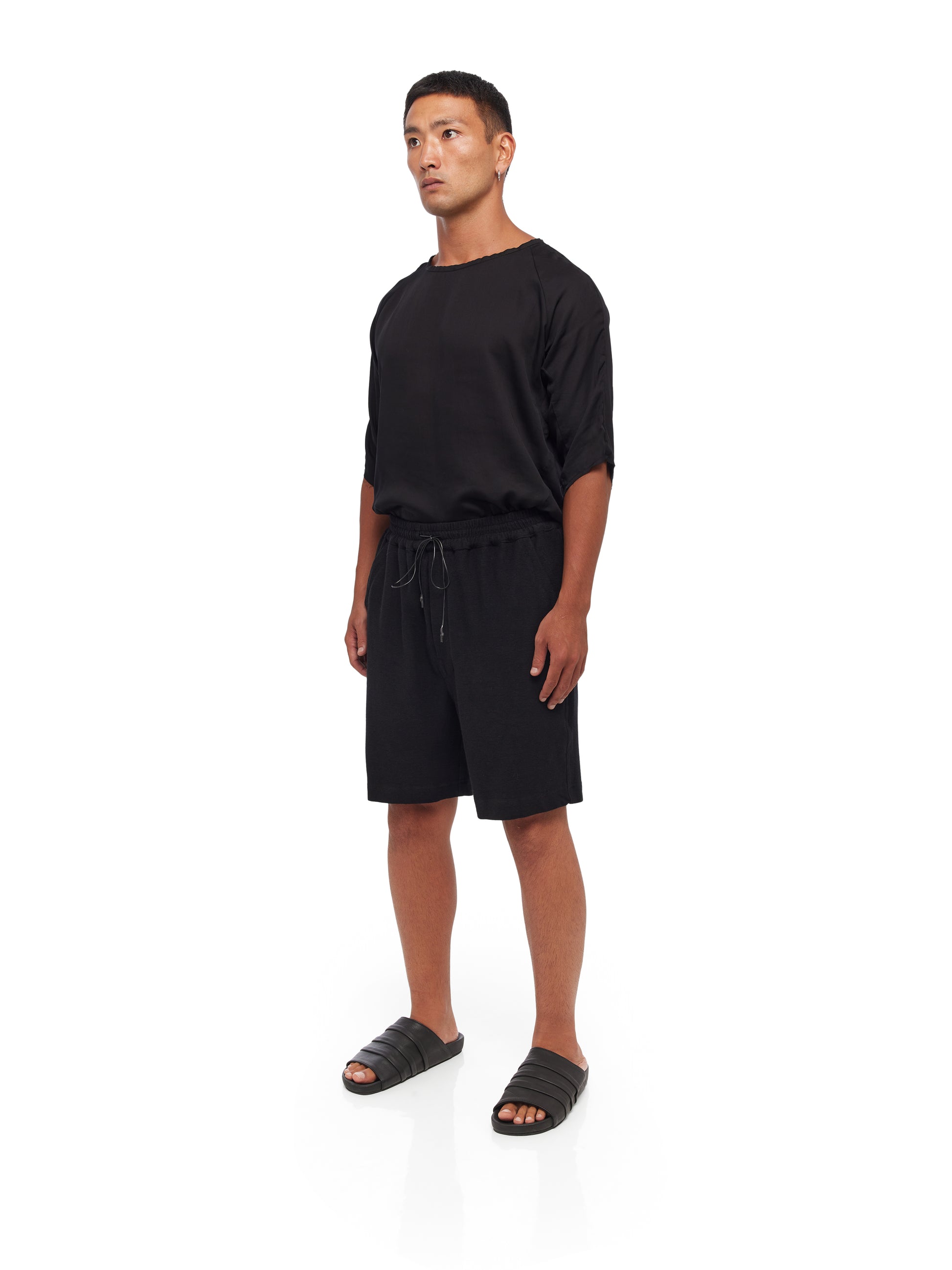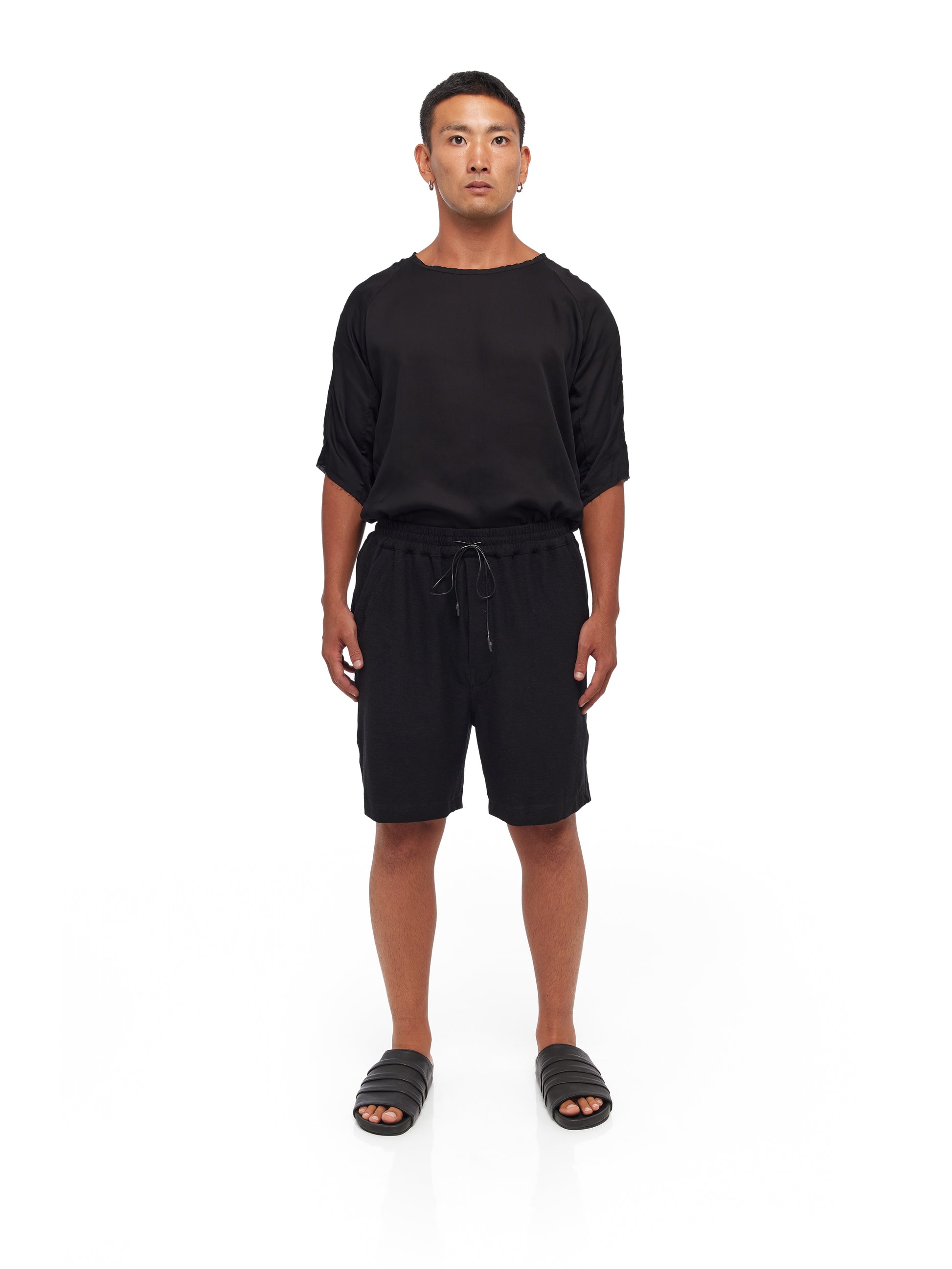 The YA|SAR Urban Bamboo Shorts, designed with a unique combination of 95% bamboo and 5% elastane for maximum comfort and flexibility. These shorts are perfect for those seeking both style and sustainability. The reversed bamboo fabric offers an exceptional soft touch, enhancing breathability and durability, while the elastane ensures a snug yet flexible fit. The design features an elasticized waistband with a drawstring to adjust for the perfect fit, metal tag detailing for a touch of luxury, and practicality with two side pockets and two back pockets for ample storage. Male model is wearing size M and is 180 cm tall.